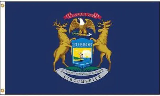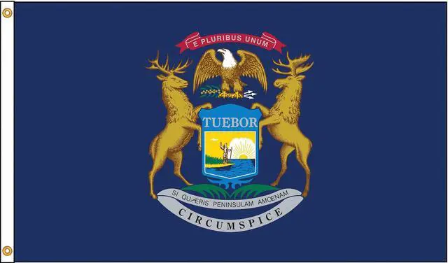State Flag, Michigan, Indoor/Outdoor, Style Digital Single/Reverse Image, Header and Grommets, Flag Height 5 ft., Flag Width 8 ft., Min. Flagpole H 30 Ft., Material 200 Denier Nylon, For Use With Flag Staff or Flag Pole. This item has been restricted from sale in the following state (s): []