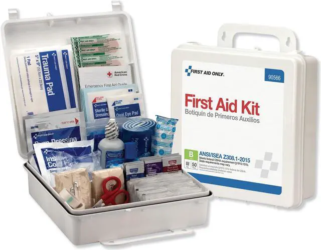 First Aid Only™ 199-pc. Class B, Type III, bulk first aid kit comes with a selection of bandages, dressings, and other supplies to help you be prepared to address a variety of emergency first aid situations. The weatherproof hard plastic case is wall mountable, with a handle for easy transport just about anywhere it's needed. Sufficient for treating 50 or more people. Contents meet 2015 ANSI Class B requirements. First Aid Kit, Kit, First Aid Kit Primary Application General Purpose, Unitized No, People Served Per Kit 50, Case Material Plastic, First Aid Kit Mounting Type Wall Mount, Height 2-3/4 In., Width 9-3/16 In., Depth 9-3/16 In., Waterproof No, First Aid Kit Application General Purpose, Number of Components 199, Number of Shelves 1, White, ANSI Z308.1-2015, Class B, First Aid ANSI Kit Type III