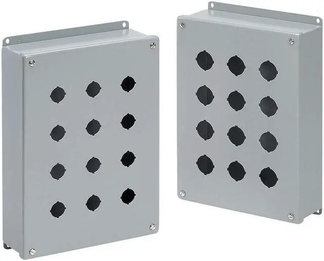 Pushbutton Enclosure, Number of Columns: 1, Number of Holes: 3, NEMA Rating: 12, Conduit Size: No Conduit Entrance Holes Provided, Hole Size: 30mm, Material: Mild Steel, Height: 8.00", Width: 3.25", Depth: 2.75", Color: ANSI 61 Gray Polyester Powder, Includes: Closed Cell Oil Resistant Gasket, Captive Cover Screws, Grounding Stud, Mounting Style: External Feet, Standards: UL Type 12, 13, CSA, Nema, cUL, IP65