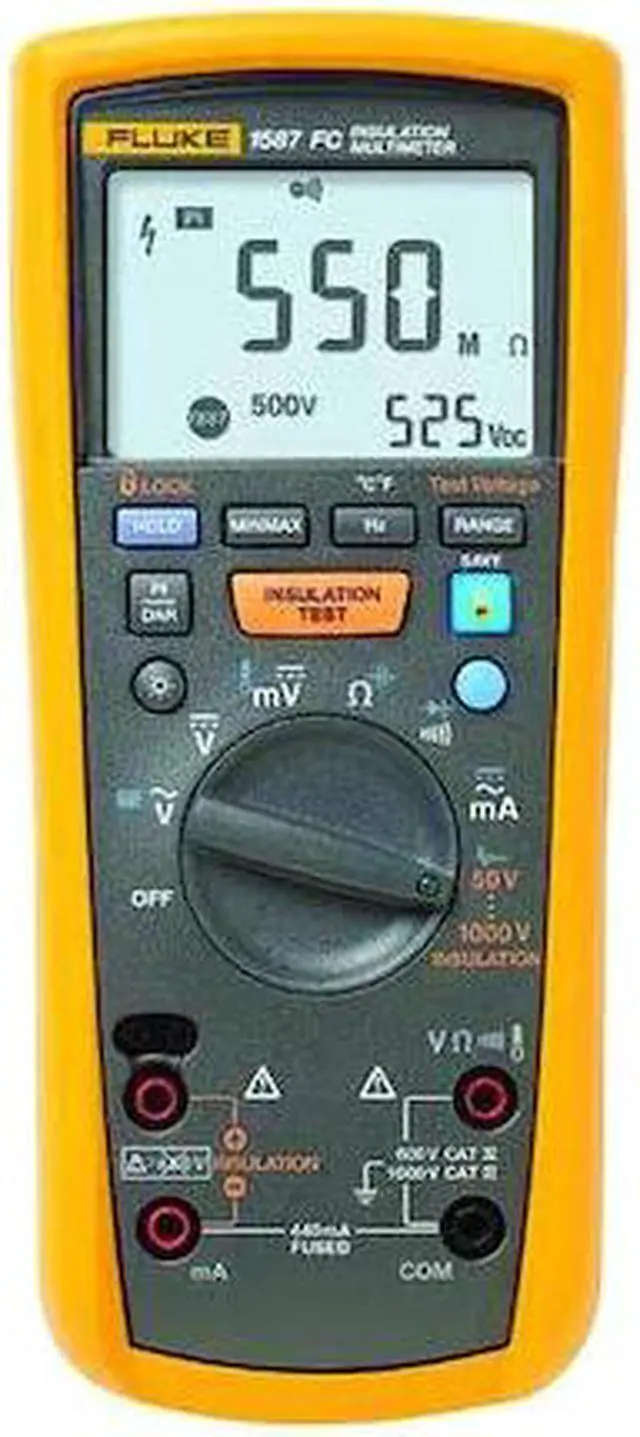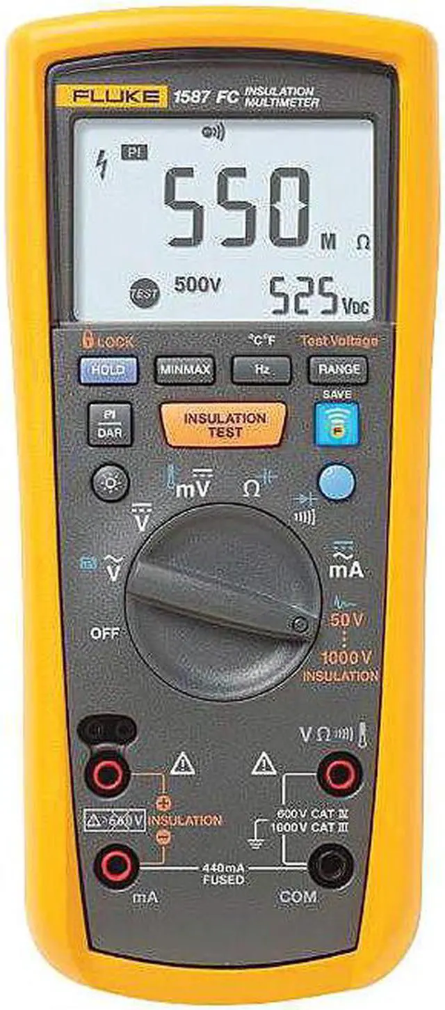 Item: Insulation Multimeter, Output Test Voltage: 50/100/250/500/1000VDC, Insulation Resistance Range: 0.01M Ohms to 2G Ohms, Live Circuit Detection: Greater Than 30V, Resistance Range: 0 to 50 megohm, Capacitance Range: 1000 nF to 9999 uF, Display: Digital LCD with Backlit, Max. AC Amps: 400mA, Max. DC Amps: 400mA, Max. AC Volts: 1000, Max. DC Volts: 1000, Temp. Range: -40 Degrees to 998 Degrees F, Auto Power Off: Yes, Diode Test: Yes, Auto Ranging: Yes, Data Logging: 6000, Interface: Bluetooth, Features: PI/DAR, Memory Storage Through Mobile App, Temperature Compensation Through Mobile App, VFD Low Pass Filter, Power Source: (4) AA Batteries, Safety Rating: CAT IV 600V, CAT III 1000V, Calibration Certificate: No, Includes: Remote Probe, Contact Temperature Probe, Manufacturers Warranty Length: 3 yr.