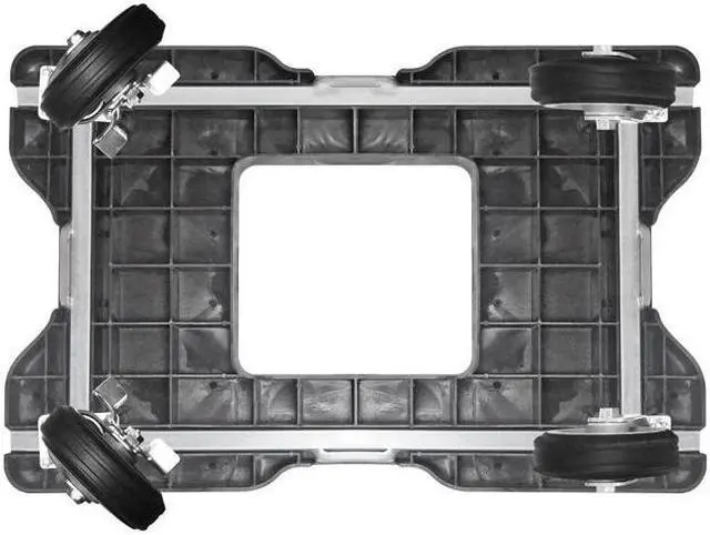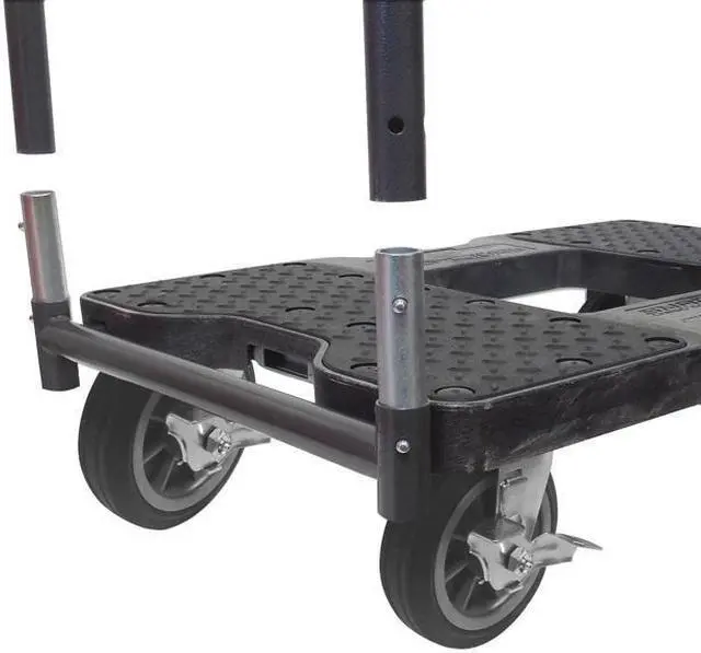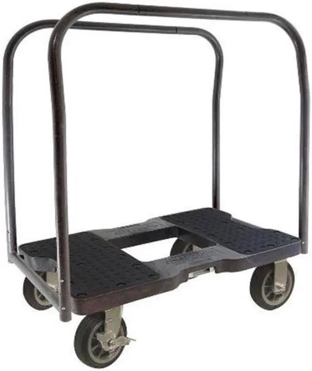 Panel Truck, Load Capacity: 1500 lb., Overall Length: 35", Overall Width: 20-1/2", Overall Height: 40-1/2", Caster Dia.: 6", Caster Material: Rubber, Caster Type: (2) Rigid, (2) Swivel with Brake, Caster Width: 1-1/4", Deck Material: HDPE, Deck Length: 32", Deck Width: 20-1/2", Deck Height: 9", Frame Material: Steel, Finish: Powder Coated, Color: Black, Handle Included: Yes, Includes: Four Sided Steel Frame with Built in Snaplocs E-Track Strap Anchors, 1-1/4" Heavy Duty Steel Bars, Oversized 6" Casters, Assembled/Unassembled: Unassembled