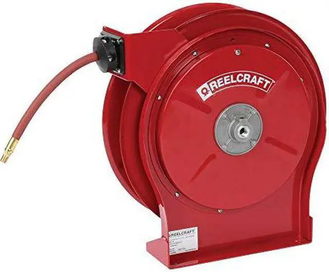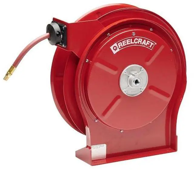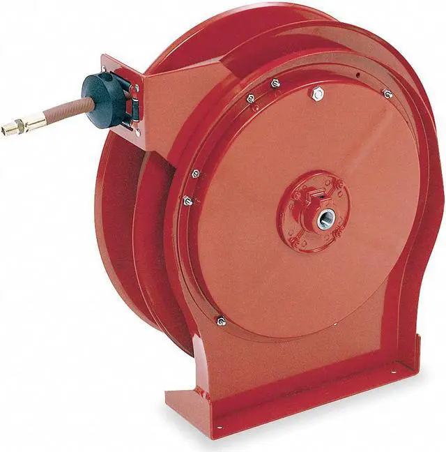 Compact design and all-steel construction allows use in tight spaces. Just pull hose out to desired length, then allow hose to rewind on reel a half turn for latch engagement. Reel is ideal for noisy environments. • Permanently lubricated swivel• Corrosion-resistant powder-coated finish Spring Return Hose Reel, Media - Hose Reels Air, Water, Max. Pressure 300 psi, Hose Inside Dia. 1/2 In., Hose Length 50 ft., Hose Included Yes, Heavy Duty, Finish - Hose Reels Powder Coated, Drive Type - Hose Reels Spring Return, Reel Inlet 3/8 In. (F)NPT, Enclosed Reel No, Hose Ends 1/2 In. (M)NPT, Hose Outlet 1/2 In. (M)NPT, Max. Temp. 150 Degrees F, Quiet Latch Latch, 17-1/2 In., Overall Width 7 In., Overall Length 16-1/2 In.