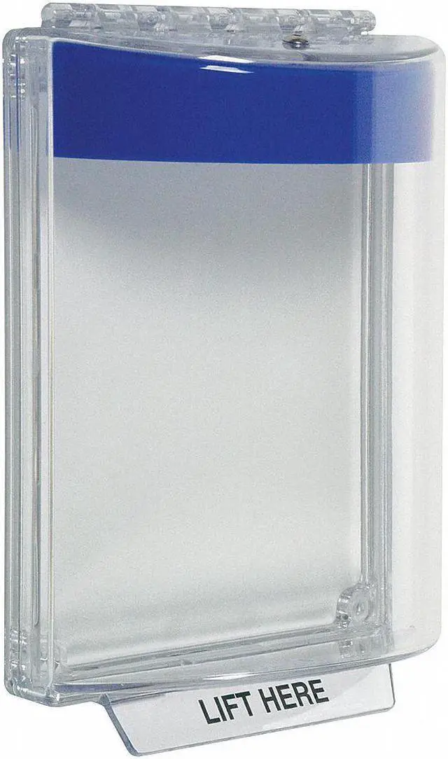 Universal Stopper Cover, Indoor, Outdoor, Color Clear/Blue, Material Polycarbonate, Mounting Surface, Width 5-7/16 In., Depth 2-21/32 In., Height 8-5/32 In., For Use With Dual Action Pull Stations, Keypads for Entry Systems, Intercom Stations, Emergency Buttons, Electrical Light Switches, Duplex Plugs, Etc., Operating Temp. -40 Degrees to 250 Degrees F, Rating IP56, Standards UL/cUL Listed, ADA