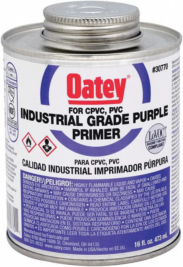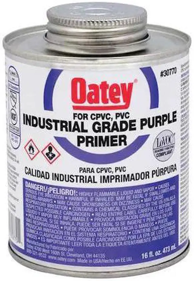 This Oatey aggressive, purple-tinted primer is ideal for use in cold weather applications. Formula removes grease, grime, surface dirt, and softens the pipe surface to allow a fast, secure solvent weld. Primer is recommended for large diameter and commercial thermoplastic piping systems, specifically CPVC Schedule 40/80. Ideal for use in areas where plumbing code requires verification that a primer has been used. Meets California South Coast Air Quality Management District (SCAQMD) 1168/316A or BAAQMD Method 40.