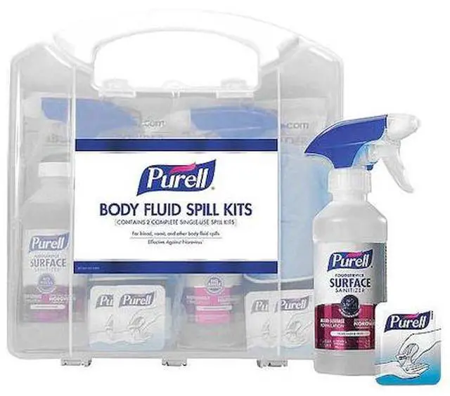 Spill Kit, Fluids Absorbed Biohazardous Liquids, Specialized Applications Body Fluid Spill, Neutralizes Chemical Type Biohazardous Liquids, Volume Absorbed Per Kit 2 L, Container Type Bag, 8 oz Container Capacity, 4 in W x 10 1/2 in L x 12 in H Container Size, Clear, Filled, Sorbents Included Absorbent Towels, (1) Hospital-Grade Solidifier, PPE Included (2) Eye Shield, (2) Gloves, (2) Hairnets, (2) Masks, (2) Pairs Shoe Covers, (2) Sleeved Gowns
