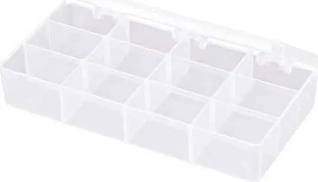 Compartment Box, Number of Compartments 12, Number of Removable Dividers 0, Outside Height 1 3/8 in, Outside Length 3 7/16 in, Outside Width 7 in, Compartment Height 1 3/16 in, Compartment Width 1 7/16 in, Compartment Length 1 1/16 in, Material Polypropylene, Color Translucent, Includes Translucent Lid and Base, ESD Conductive No, Removable Dividers No. This item has been restricted from sale in the following state (s): []