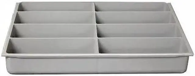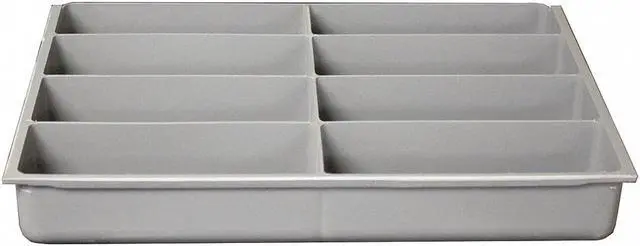 Compartment Drawer Insert, Compartment HxWxD (8) 6 25/64 in x 2 13/64 in, Fits Box Depth 9 1/4 in, Compartment Depth 2 13/64 in, Fits Box Height 2 in, Compartment Width 6 25/64 in, Fits Box Width 13 3/8 in, Number of Dividers 0, Overall Depth 9 1/4 in, Overall Height 2 in, Overall Width 13 3/8 in, Adjustable Dividers No, Color Gray, Compatible Manufacturer Model Number 226-95, Finish Powder Coated, Number of Compartments 8, Load Capacity 24 lb, Material Polypropylene. This item has been restricted from sale in the following state (s): []