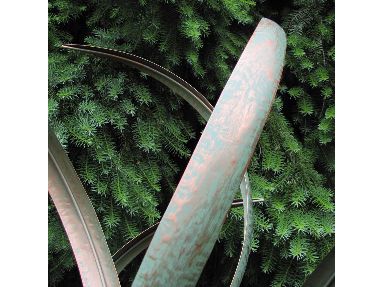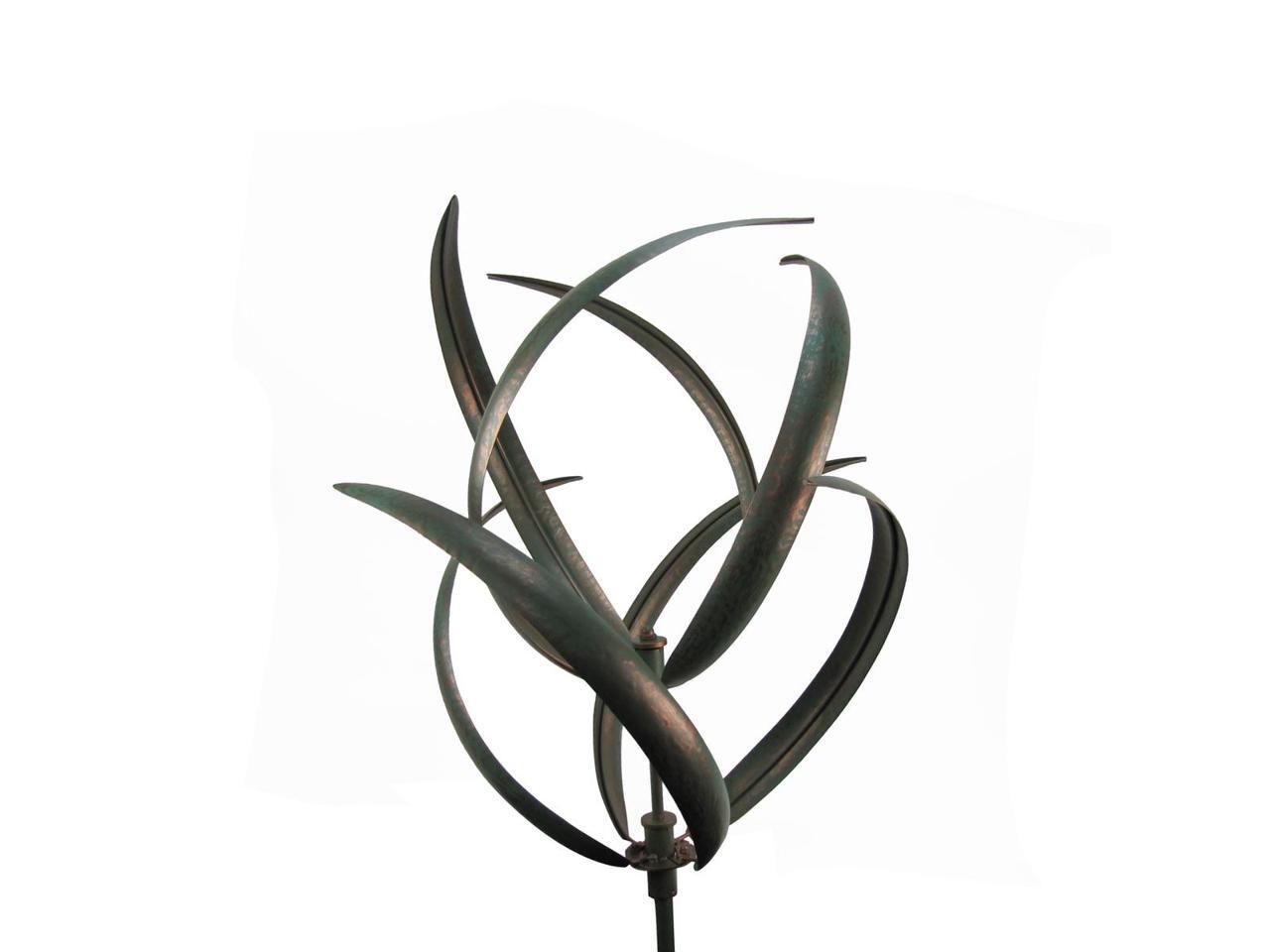 Distressed Verdigris metal blades spin in opposite directions to form a pattern that will fascinate