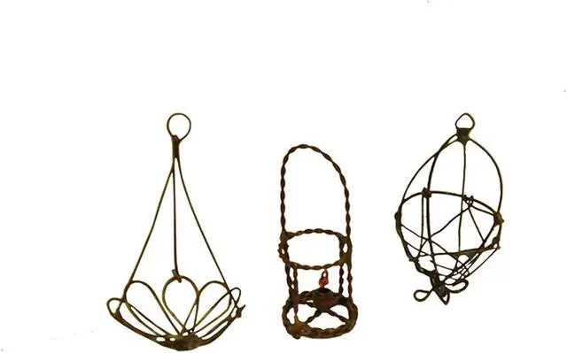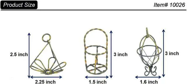 Accent your miniature garden landscape with these three unique wire baskets. Each one has a loop perfect for hanging on our shepherd's hook or scrolled garden hook. One of the wire baskets contains a mini 'candle', which would be a great for lighting along the garden path in the evening, or hang it inside the Grapevine Fairy Sphere to provide a light for reading by. Fill another one with a little sphagnum moss and plant a little fairy vine or other mini plant in it. The third wire basket could be filled with some reindeer moss for a fern-like touch.