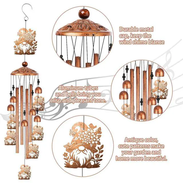 Gnome Wind Chimes for Outside, Garden Gnome Gifts for Women Men Metal Windchimes Outdoors, Floral Hat Design Home Garden Patio Yard Decor