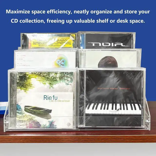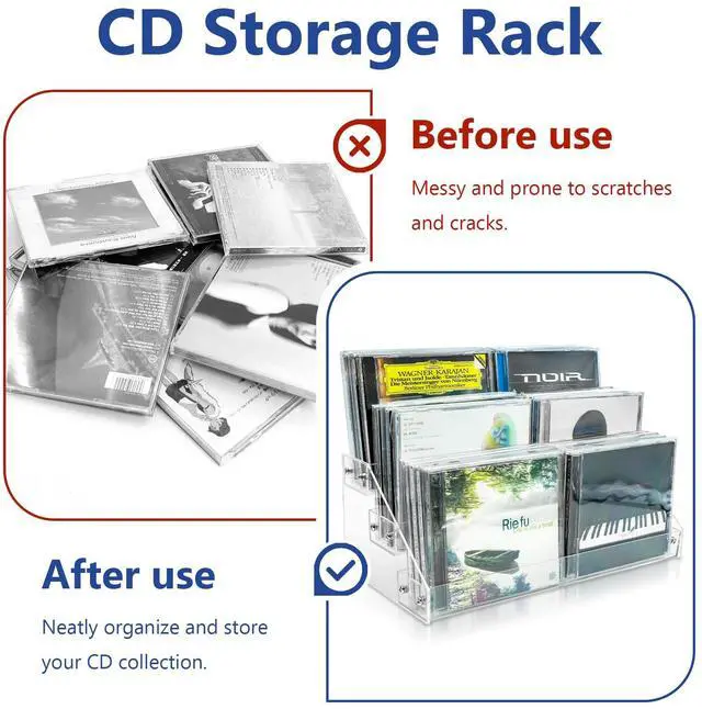4 tiers CD display racks.Shelf Slot width is 1.9 inches, The desktop organizer set comes with screws &nuts, can be installed in 5 mins.Our vertical organizer is combined with a raised front shelf lip to ensure that your CDs/DVDs safe and stable.open design makes it simple to insert or take out your CD