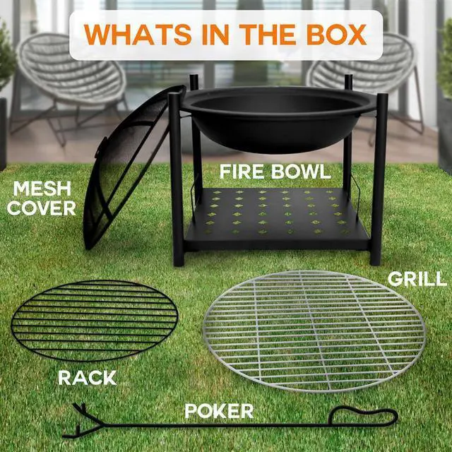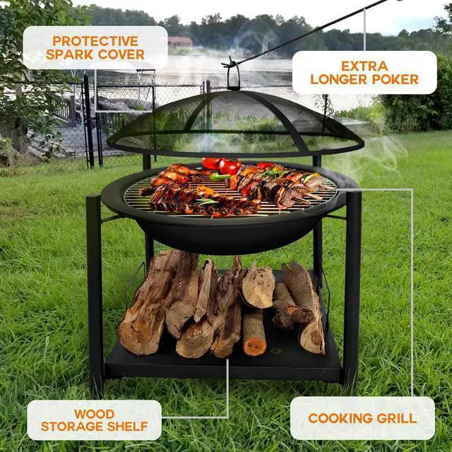 The SereneLife Outdoor Wood Fire Pit offers a perfect blend of style and functionality for outdoor gatherings. This 26" steel fire pit is built with a high-temperature paint finish, providing durability and long-term performance. It includes a mesh spark screen for added safety, and the fire is elevated with a built-in wood grate, making it easier to control the flames. This multi-functional fire pit also doubles as a BBQ grill for outdoor cooking. With convenient wood storage shelves, its ideal for picnics, camping trips, or cozy bonfire nights. Assembly is quick, taking only about 15 minutes.