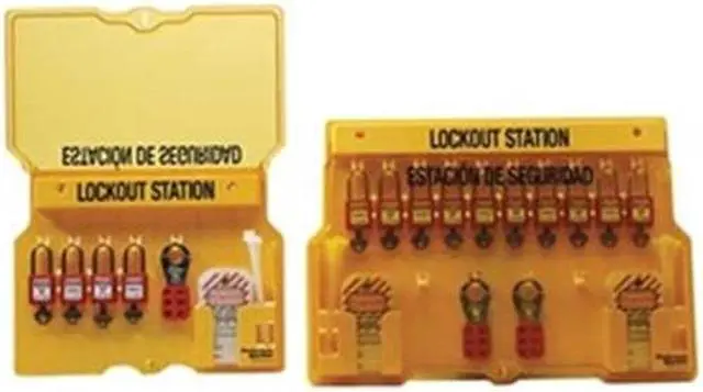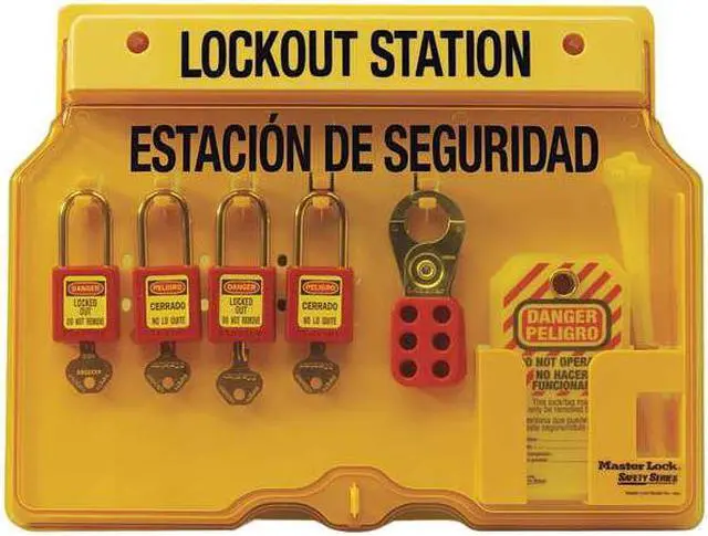 Lockout Station, Cable Lockouts Included 0, Cover Type Closed, Filled Yes, Number of Hasps Included 2, Number of Lockouts Included 18, Number of Padlocks Included 4, Number of Tags Included 12, Visibility Inside Clear Door/Window, For Lockout Type General, Language English, Spanish, Mount Type Fasteners, Background Color Yellow, Includes (1) 497Ax Spanish/English Danger Do Not Operate Safety Tags (12 Tags/Pack), (2) 420 Lockout Hasps, (4) 410 Red Zenex (TM) Thermoplastic Safety Padlocks. This item has been restricted from sale in the following state (s): []