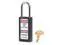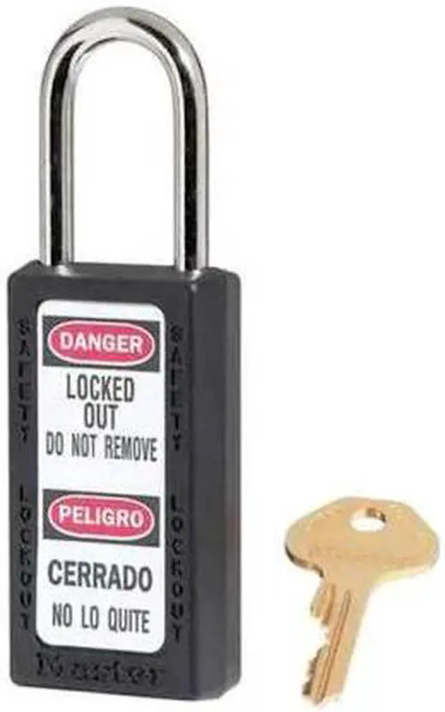 Lockout Padlock, Body Color Black, Body Height 3 in, Body Material Thermoplastic, Body Thickness 3/4 in, Body Width 1 1/2 in, Header Danger, Horizontal Shackle Clearance 13/16 in, Key Style Standard, Key Type Keyed Different, Non-Removable Key Yes, Resistance Properties Chemical Resistant, Shackle Diameter 1/4 in, Shackle Height 1 1/2 in, Shackle Material Metal, Shackle Type Open, Vertical Shackle Clearance 1 1/2 in, Width Across Shackle 13/16 in, Features Reserved for Safety Cylinder. This item has been restricted from sale in the following state (s): []