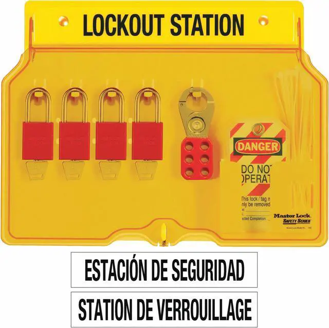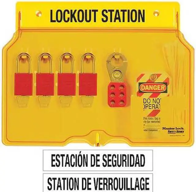 Lockout Station, Cable Lockouts Included 0, Cover Type Closed, Filled Yes, Number of Hasps Included 2, Number of Lockouts Included 18, Number of Padlocks Included 4, Number of Tags Included 12, Visibility Inside Clear Door/Window, For Lockout Type General, Language English, Mount Type Fasteners, Background Color Yellow, Includes (1) 497A Do Not Operate Laminated Safety Tags (12-Pack), (2) 420 Lockout Hasps, (4) A1106RED Anodized Aluminum Safety Padlocks, Key Type Keyed Different. This item has been restricted from sale in the following state (s): []