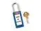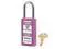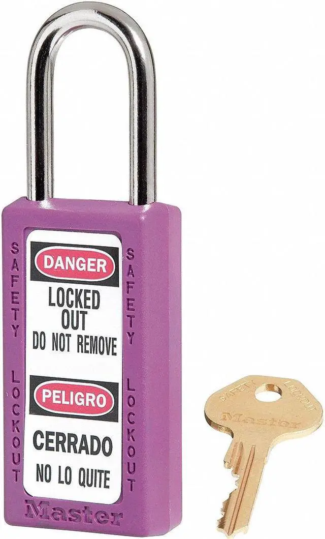 Lockout Padlock, Body Color Purple, Body Height 3 in, Body Material Thermoplastic, Body Thickness 3/4 in, Body Width 1 1/2 in, Header Danger, Horizontal Shackle Clearance 13/16 in, Key Style Standard, Key Type Keyed Different, Non-Removable Key Yes, Resistance Properties Chemical Resistant, Shackle Diameter 1/4 in, Shackle Height 1 1/2 in, Shackle Material Metal, Shackle Type Open, Vertical Shackle Clearance 1 1/2 in, Width Across Shackle 13/16 in, Features Reserved for Safety Cylinder. This item has been restricted from sale in the following state (s): []