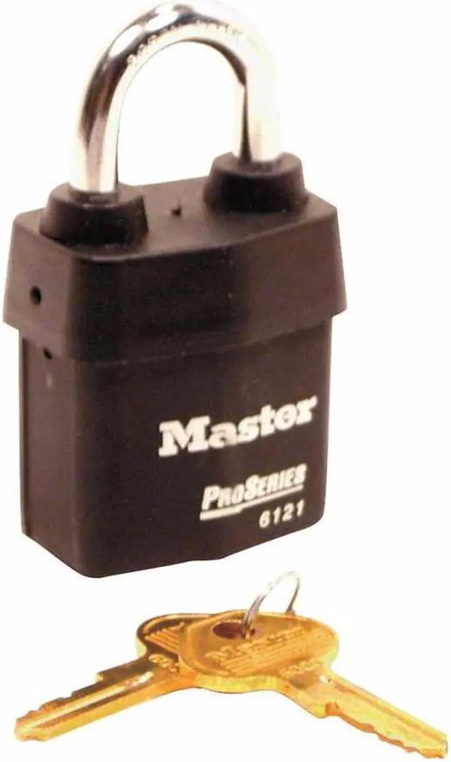 Padlock, Shackle Dia. 5/16 in, Shackle Height 1 1/8 in, Shackle Width 7/8 in, Shackle Material Boron, Body Height 2 13/16 in, Body Width 2 1/8 in, Body Thickness 1 in, Body Material Steel, Number of Bumpers 0, Number of Pins 5 Pin, Key Type Alike, Control Key Registration Required No, Opens with Key No. 10G100, Body Color Black, Body Finish Laminated, Keyway Type Master K6000, Weather Resistant Yes, High Security Yes, Interchangeable Core No, Padlock Body Shape Rectangular, Rekeyable Yes.