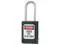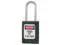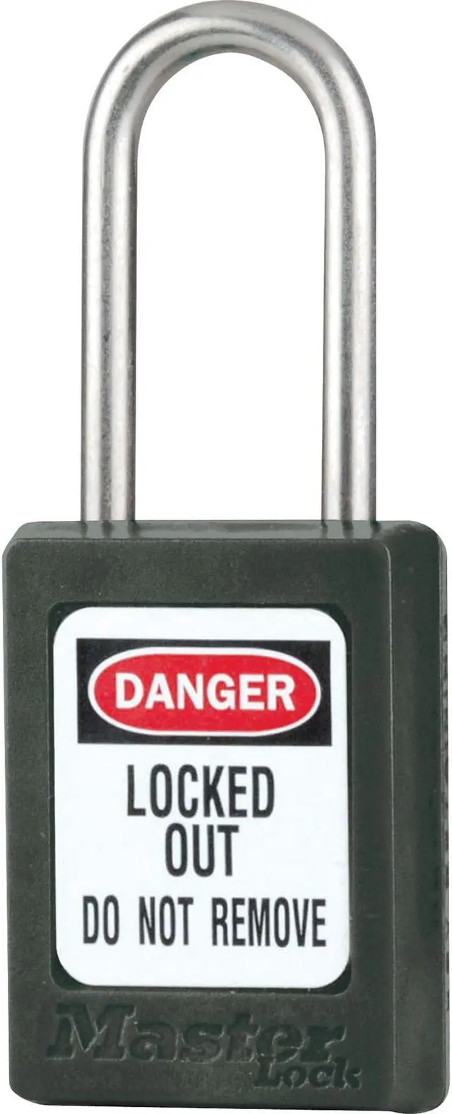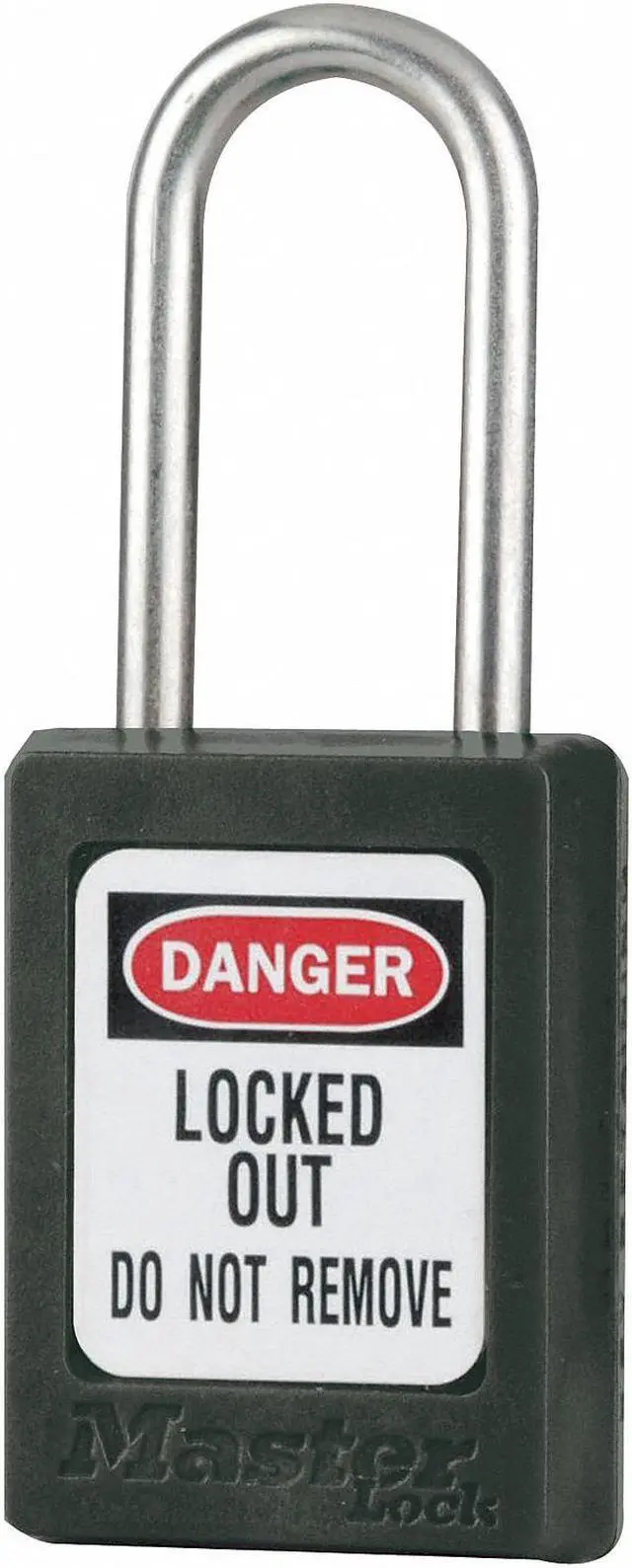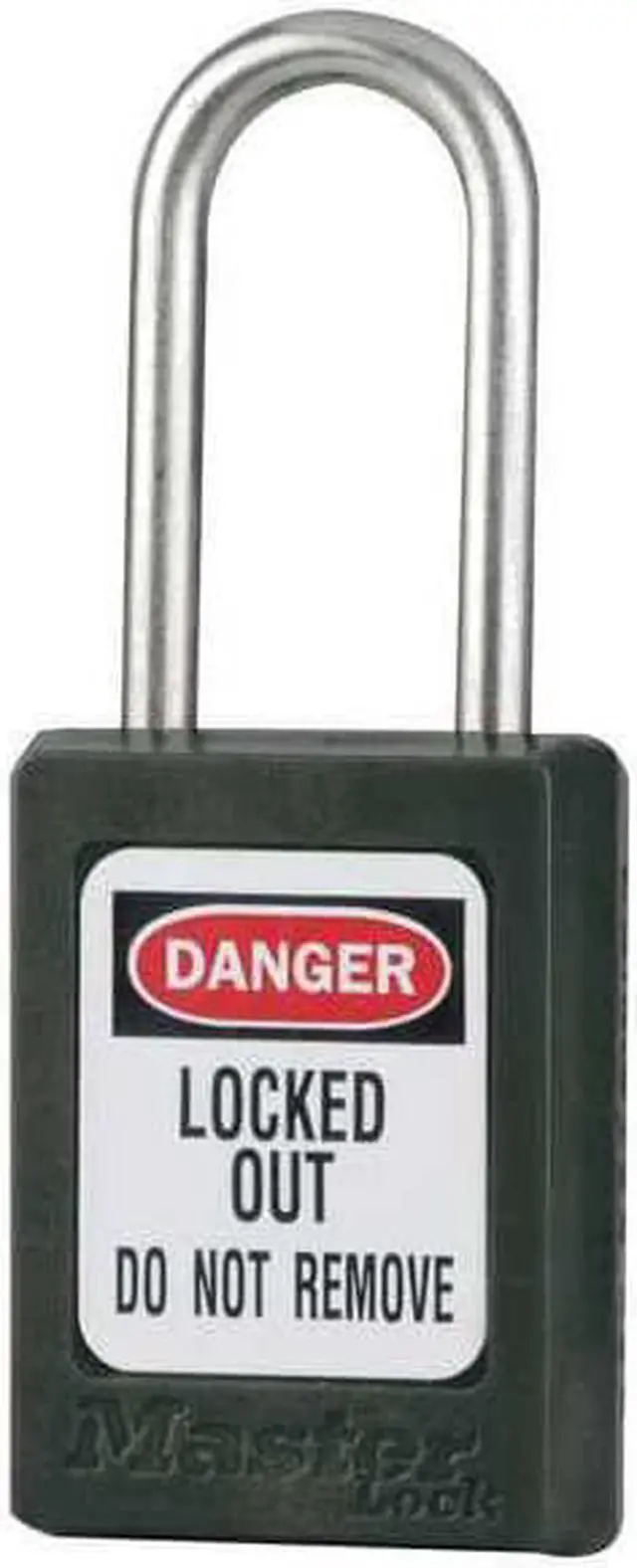 Lockout Padlock, Body Color Black, Body Height 1 7/8 in, Body Material Thermoplastic, Body Thickness 11/16 in, Body Width 1 3/8 in, Header Danger, Horizontal Shackle Clearance 5/8 in, Key Style Standard, Key Type Keyed Different, Non-Removable Key Yes, Resistance Properties Corrosion Resistant, Shackle Diameter 3/16 in, Shackle Height 1 1/2 in, Shackle Material Stainless Steel, Shackle Type Open, Vertical Shackle Clearance 1 1/2 in, Width Across Shackle 5/8 in, Includes Labels. This item has been restricted from sale in the following state (s): []