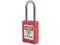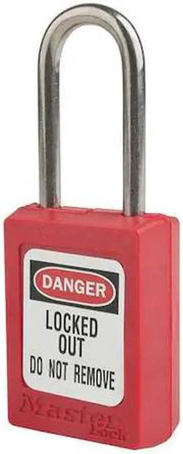 Lockout Padlock, Body Color Red, Body Height 1 13/16 in, Body Material Thermoplastic, Body Thickness 11/16 in, Body Width 1 3/8 in, Header Danger, Horizontal Shackle Clearance 5/8 in, Key Style Standard, Key Type Keyed Alike, Non-Removable Key Yes, Resistance Properties Corrosion Resistant, Shackle Diameter 3/16 in, Shackle Height 1 1/2 in, Shackle Material Stainless Steel, Shackle Type Open, Vertical Shackle Clearance 1 1/2 in, Width Across Shackle 5/8 in, Includes (2) Keys, Labels. This item has been restricted from sale in the following state (s): []