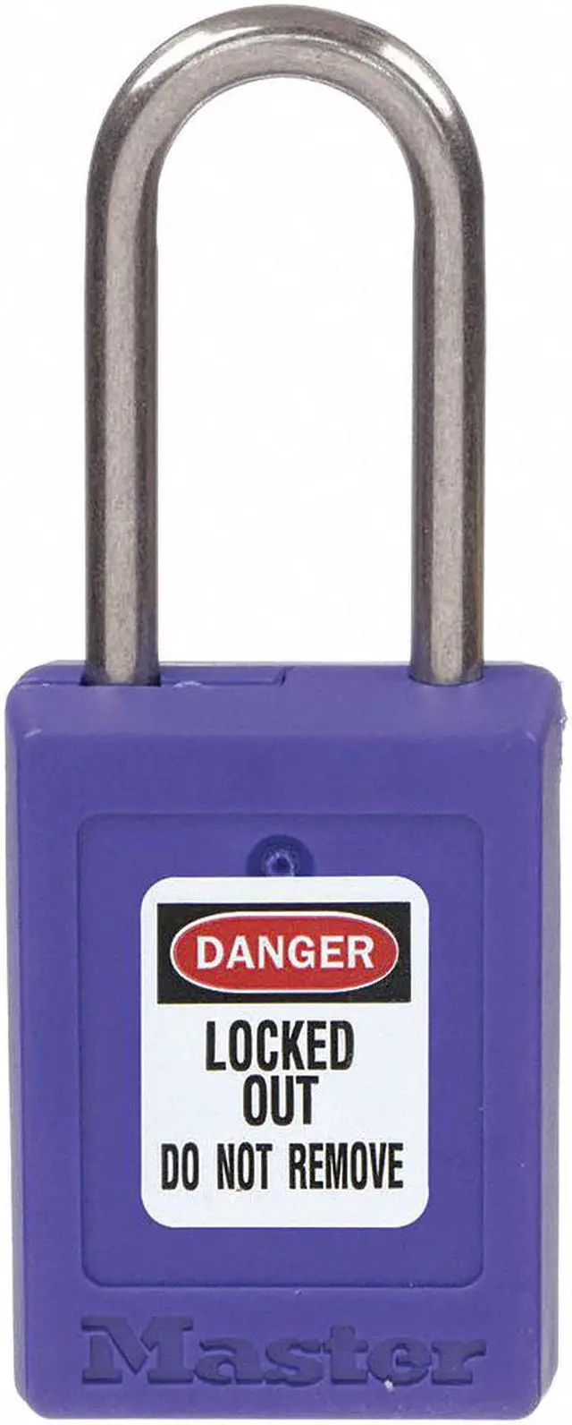 Lockout Padlock, Body Color Blue, Body Height 1 7/8 in, Body Material Thermoplastic, Body Thickness 11/16 in, Body Width 1 3/8 in, Header Danger, Horizontal Shackle Clearance 5/8 in, Key Style Standard, Key Type Keyed Different, Non-Removable Key Yes, Resistance Properties Corrosion Resistant, Shackle Diameter 3/16 in, Shackle Height 1 1/2 in, Shackle Material Stainless Steel, Shackle Type Open, Vertical Shackle Clearance 1 1/2 in, Width Across Shackle 5/8 in, Includes Labels. This item has been restricted from sale in the following state (s): []