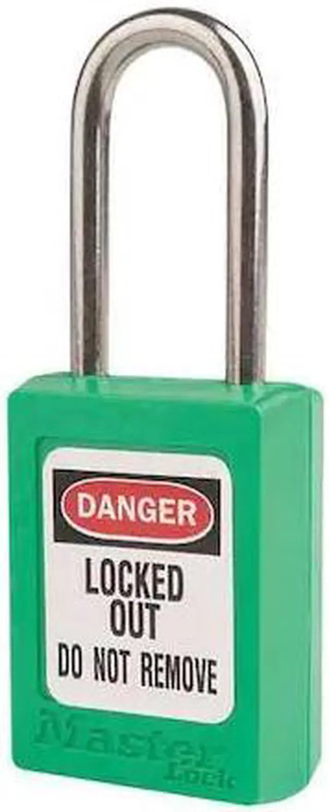 Lockout Padlock, Body Color Green, Body Height 1 13/16 in, Body Material Thermoplastic, Body Thickness 11/16 in, Body Width 1 3/8 in, Header Danger, Horizontal Shackle Clearance 5/8 in, Key Style Standard, Key Type Keyed Alike, Non-Removable Key Yes, Resistance Properties Corrosion Resistant, Shackle Diameter 3/16 in, Shackle Height 1 1/2 in, Shackle Material Stainless Steel, Shackle Type Open, Vertical Shackle Clearance 1 1/2 in, Width Across Shackle 5/8 in, Includes (2) Keys, Labels. This item has been restricted from sale in the following state (s): []