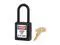 Lockout Padlock, Body Color Black, Body Height 1 3/4 in, Body Material Thermoplastic, Body Thickness 3/4 in, Body Width 1 1/2 in, Header Danger, Horizontal Shackle Clearance 13/16 in, Key Style Standard, Key Type Keyed Alike, Non-Removable Key Yes, Resistance Properties Non-Conductive, Shackle Diameter 1/4 in, Shackle Height 1 1/2 in, Shackle Material Plastic, Shackle Type Open, Vertical Shackle Clearance 1 1/2 in, Width Across Shackle 13/16 in, Includes (2) Keys, Labels, Labeling Label Included. This item has been restricted from sale in the following state (s): []