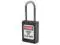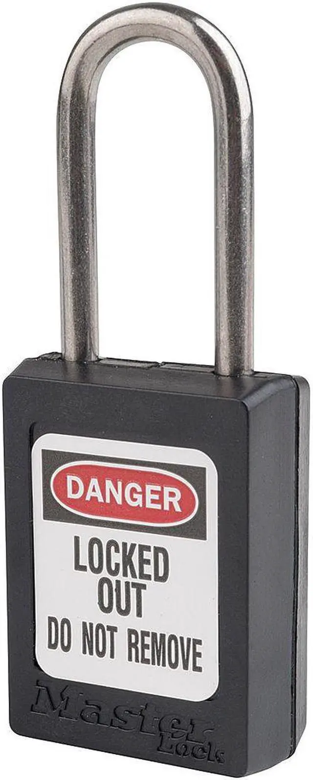 Lockout Padlock, Body Color Black, Body Height 1 13/16 in, Body Material Thermoplastic, Body Thickness 11/16 in, Body Width 1 3/8 in, Header Danger, Horizontal Shackle Clearance 5/8 in, Key Style Standard, Key Type Keyed Alike, Non-Removable Key Yes, Resistance Properties Corrosion Resistant, Shackle Diameter 3/16 in, Shackle Height 1 1/2 in, Shackle Material Stainless Steel, Shackle Type Open, Vertical Shackle Clearance 1 1/2 in, Width Across Shackle 5/8 in, Includes (2) Keys, Labels. This item has been restricted from sale in the following state (s): []
