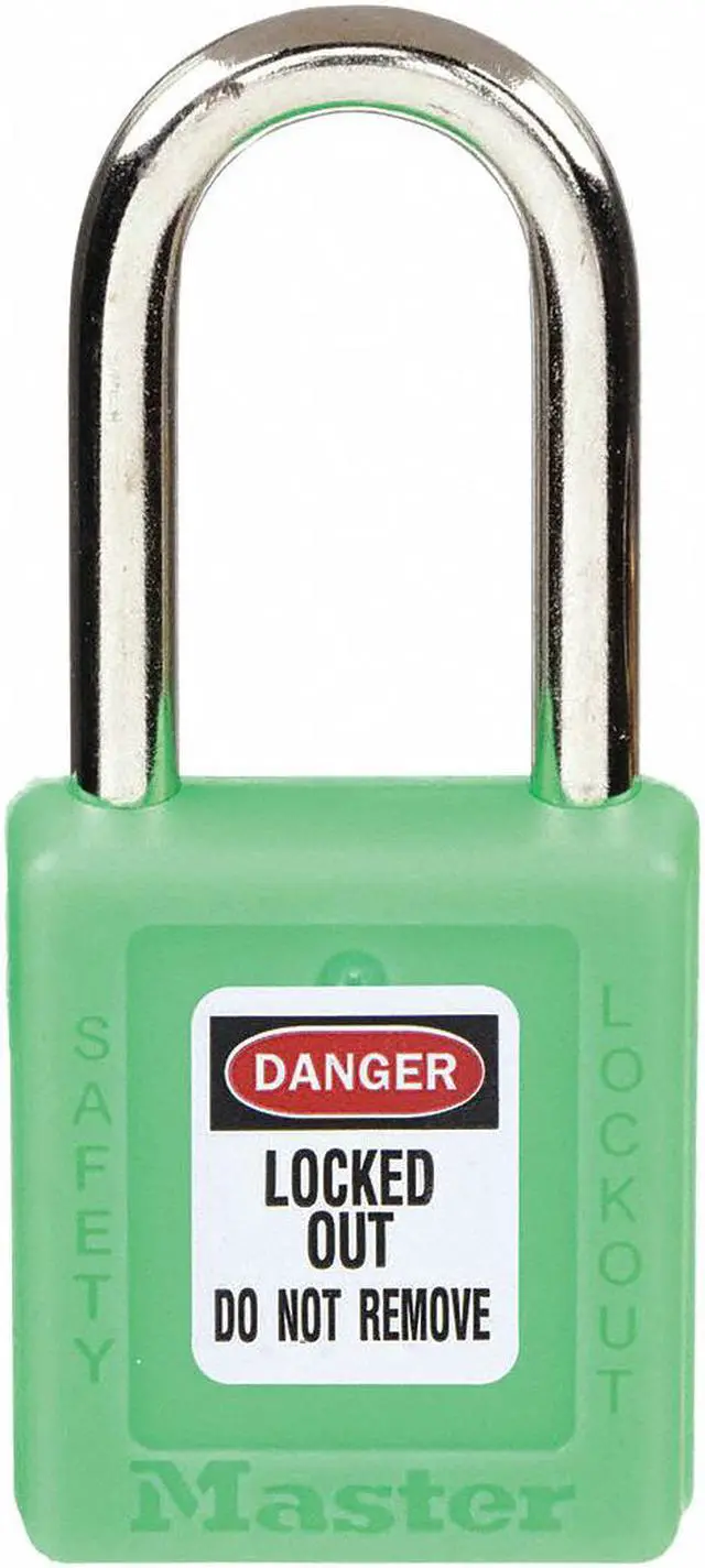 Lockout Padlock, Body Color Green, Body Height 1 3/4 in, Body Material Thermoplastic, Body Thickness 3/4 in, Body Width 1 1/2 in, Header Danger, Horizontal Shackle Clearance 13/16 in, Key Style Standard, Key Type Keyed Alike, Non-Removable Key Yes, Resistance Properties Chemical Resistant, Shackle Diameter 1/4 in, Shackle Height 1 1/2 in, Shackle Material Hardened Steel, Shackle Type Open, Vertical Shackle Clearance 1 1/2 in, Width Across Shackle 13/16 in. This item has been restricted from sale in the following state (s): []