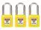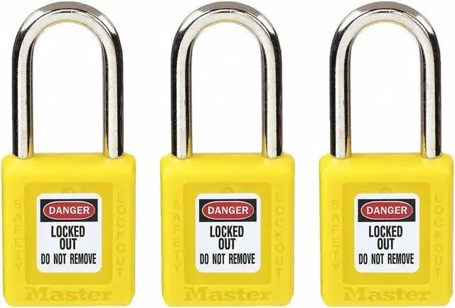 Lockout Padlock, Body Color Yellow, Body Height 1 3/4 in, Body Material Thermoplastic, Body Thickness 3/4 in, Body Width 1 1/2 in, Header Danger, Horizontal Shackle Clearance 13/16 in, Key Style Standard, Key Type Keyed Alike, Non-Removable Key Yes, Resistance Properties Chemical Resistant, Shackle Diameter 1/4 in, Shackle Height 1 1/2 in, Shackle Material Steel, Shackle Type Open, Vertical Shackle Clearance 1 1/2 in, Width Across Shackle 1/4 in, Includes (2) Keys, Labels. This item has been restricted from sale in the following state (s): []