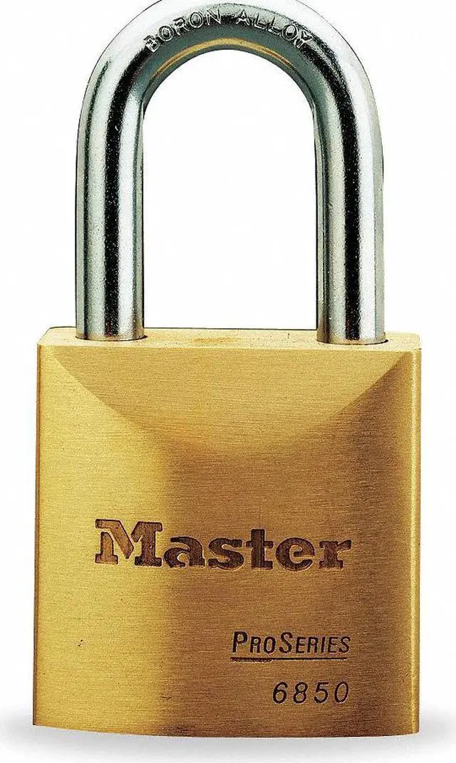 Padlock, Shackle Dia. 3/8 in, Shackle Height 2 1/2 in, Shackle Width 25/32 in, Shackle Material Boron, Body Height 2 5/16 in, Body Width 2 in, Body Thickness 1 in, Body Material Brass, Number of Bumpers 0, Number of Pins 5 Pin, Key Type Alike, Control Key Registration Required No, Opens with Key No. 10G013, Body Color Brass, Keyway Type Master K6000, Weather Resistant Yes, High Security Yes, Interchangeable Core No, Padlock Body Shape Rectangular, Rekeyable Yes, Shackle Type Long Shackle.