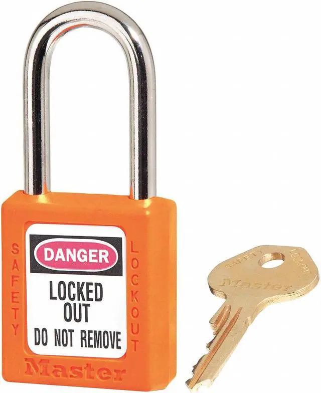 Lockout Padlock, Body Color Orange, Body Height 1 3/4 in, Body Material Thermoplastic, Body Thickness 3/4 in, Body Width 1 1/2 in, Header Danger, Horizontal Shackle Clearance 13/16 in, Key Style Standard, Key Type Keyed Alike, Non-Removable Key Yes, Resistance Properties Chemical Resistant, Shackle Diameter 1/4 in, Shackle Height 1 1/2 in, Shackle Material Metal, Shackle Type Open, Vertical Shackle Clearance 1 1/2 in, Width Across Shackle 13/16 in, Features Reserved for Safety Cylinder. This item has been restricted from sale in the following state (s): []
