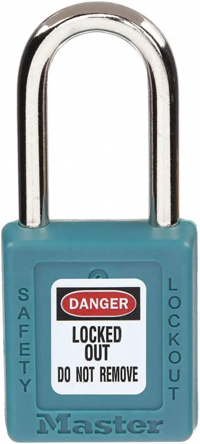 Lockout Padlock, Body Color Teal, Body Height 1 3/4 in, Body Material Thermoplastic, Body Thickness 3/4 in, Body Width 1 1/2 in, Header Danger, Horizontal Shackle Clearance 13/16 in, Key Style Standard, Key Type Keyed Alike, Non-Removable Key Yes, Resistance Properties Chemical Resistant, Shackle Diameter 1/4 in, Shackle Height 1 1/2 in, Shackle Material Metal, Shackle Type Open, Vertical Shackle Clearance 1 1/2 in, Width Across Shackle 13/16 in, Features Reserved for Safety Cylinder. This item has been restricted from sale in the following state (s): []