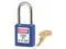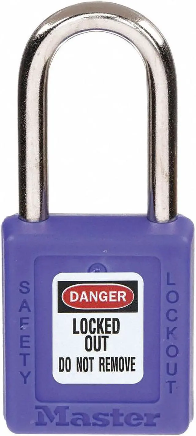 Lockout Padlock, Body Color Blue, Body Height 1 3/4 in, Body Material Thermoplastic, Body Thickness 3/4 in, Body Width 1 1/2 in, Header Danger, Horizontal Shackle Clearance 13/16 in, Key Style Standard, Key Type Keyed Alike, Non-Removable Key Yes, Resistance Properties Chemical Resistant, Shackle Diameter 1/4 in, Shackle Height 1 1/2 in, Shackle Material Metal, Shackle Type Open, Vertical Shackle Clearance 1 1/2 in, Width Across Shackle 13/16 in, Features Reserved for Safety Cylinder. This item has been restricted from sale in the following state (s): []
