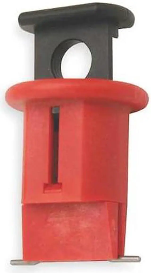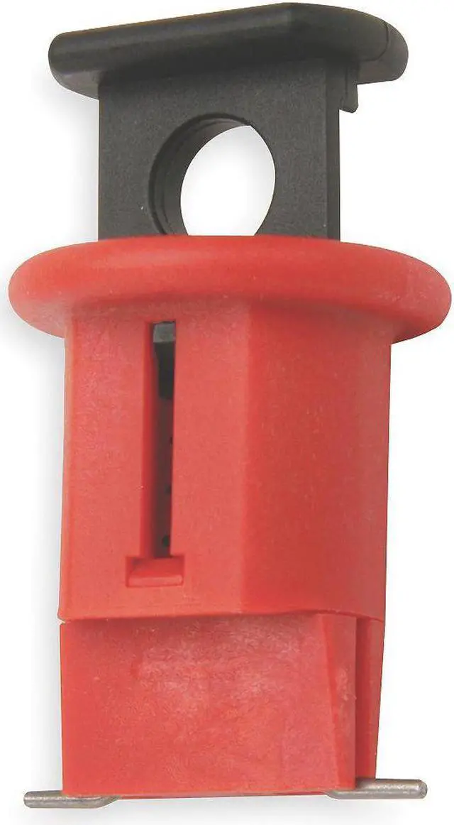 DIN Style Miniature Breaker Lockout, Pin-Out, Wide, Circuit Breaker Voltage 120/277, For Use With European Circuits on Machinery, Max. Number of Padlocks 1, Padlock Shackle Max. Dia. 9/32 in, Red, Height 1 in, Width 1 in, Length 9/16 in, Material Nylon. This item has been restricted from sale in the following state (s): []