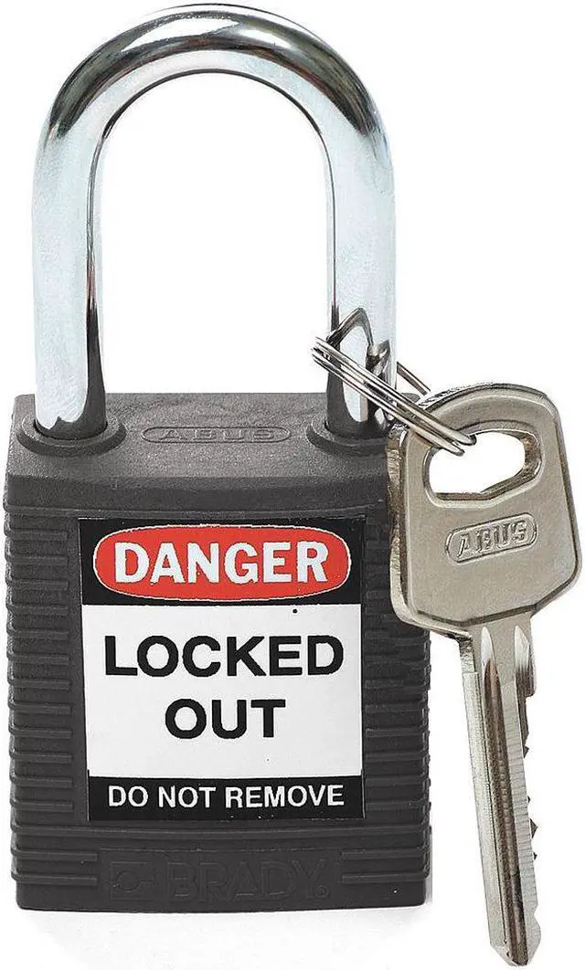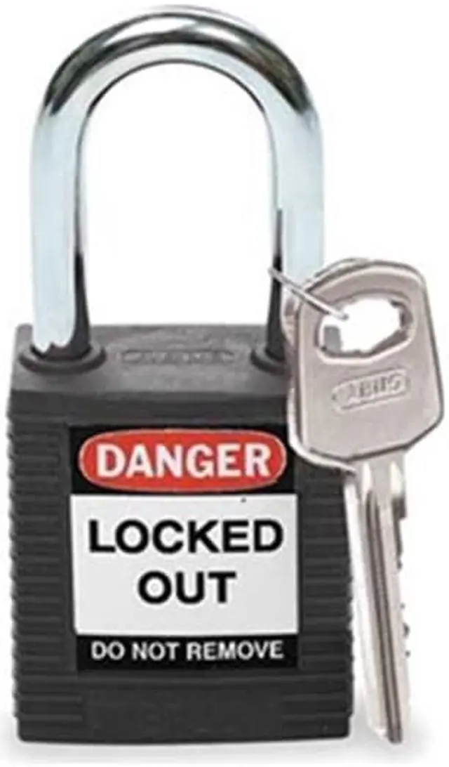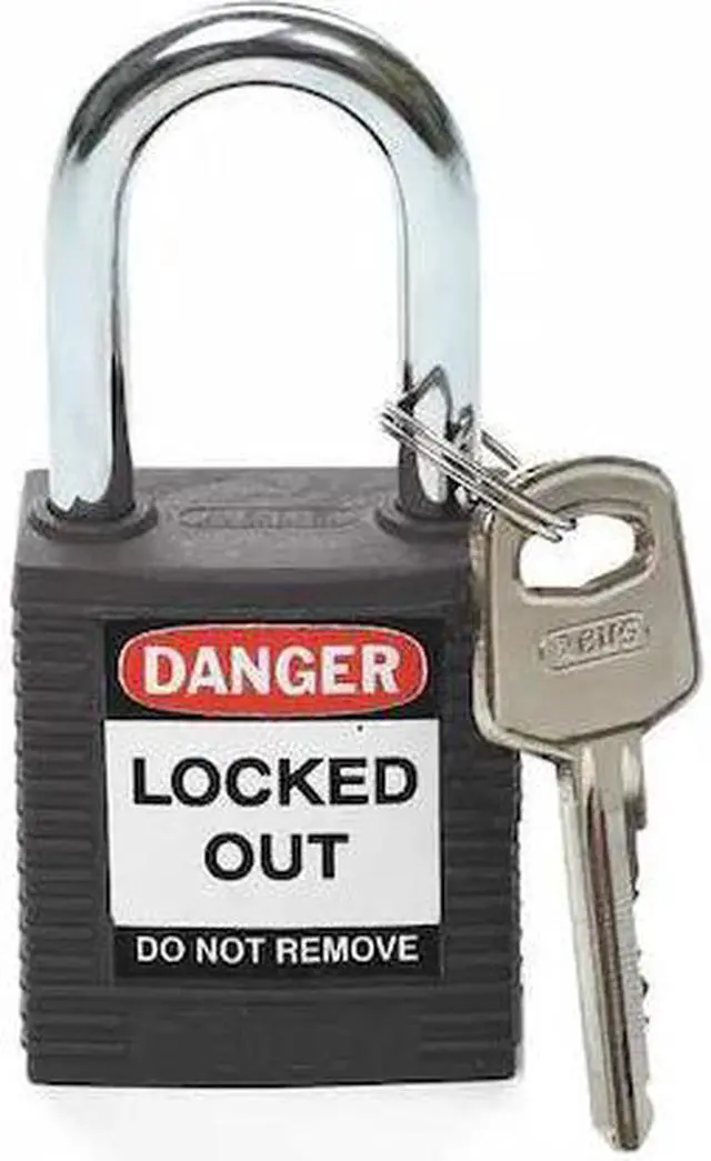 Lockout Padlock, Key Type Different, Body Material Thermoplastic, Shackle Dia. 1/4 in, Shackle Height 1 1/2 in, Shackle Material Hardened Steel, Shackle Width 3/4 in, Body Width 1 1/2 in, Legend Danger Locked Out Do Not Remove, Includes (3) Lockout Labels, Standards OSHA 1910.147, Body Height 1 3/4 in, Body Color Black, Shackle Type Open. This item has been restricted from sale in the following state (s): []
