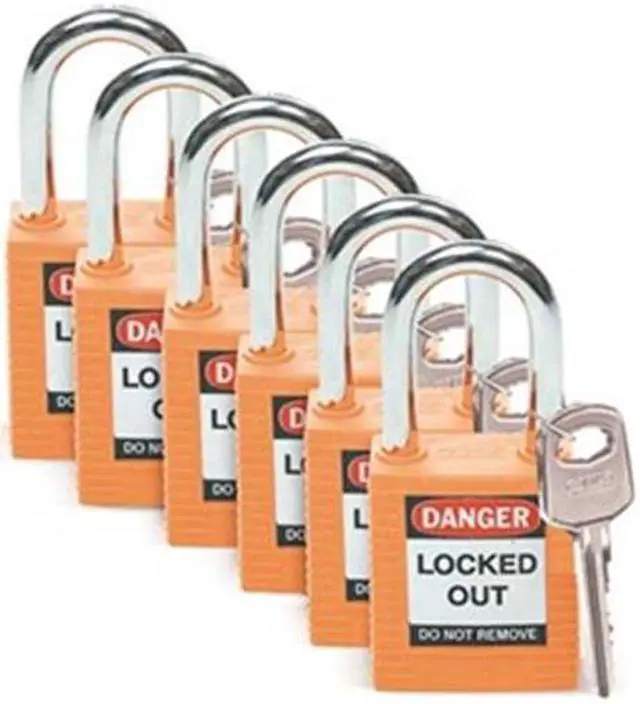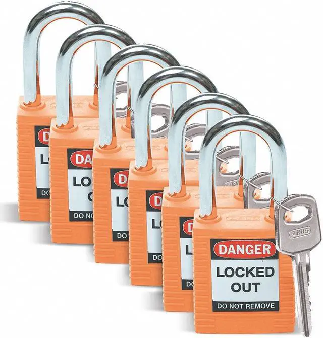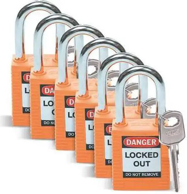 Lockout Padlock, Key Type Different, Body Material Thermoplastic, Shackle Dia. 1/4 in, Shackle Height 1 1/2 in, Shackle Material Hardened Steel, Shackle Width 3/4 in, Body Width 1 1/2 in, Legend Danger Locked Out Do Not Remove, Includes (3) Lockout Labels, Standards OSHA 1910.147, Body Height 1 3/4 in, Body Color Orange, Shackle Type Open, Package Quantity 6. This item has been restricted from sale in the following state (s): []