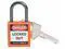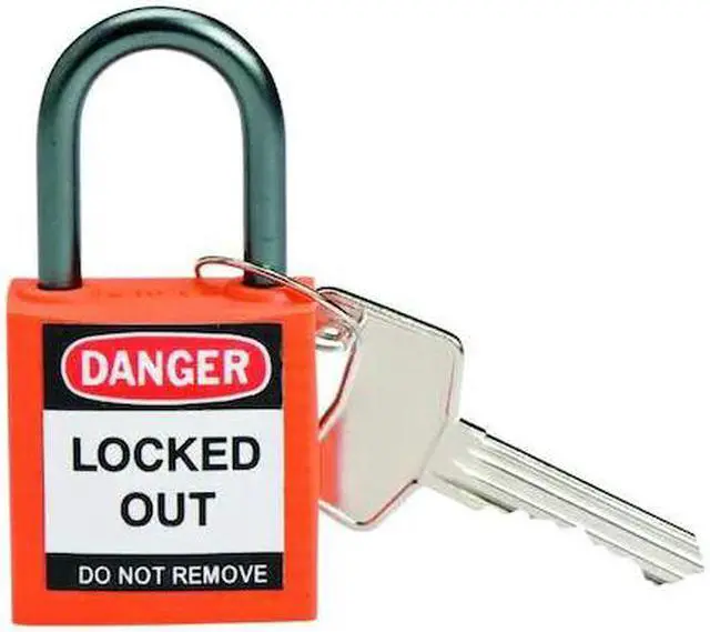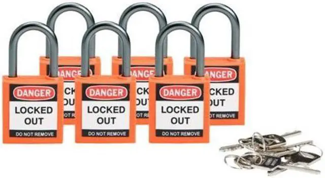 Lockout Padlock, Key Type Different, Body Material Thermoplastic, Shackle Dia. 13/64 In., Shackle Height 1 In., Shackle Material Aluminum, Shackle Width 3/4 In., Body Width 1-1/5 In., Body Thickness 5/8 In., Includes English, Spanish, French Lockout Labels, Standards OSHA 1910.147, Body Height 1-2/5 In., Body Color Orange, Control Key Registration Required No, Shackle Type Open, Number of Keys 1, Number of Pins 5, Padlock Body Shape Rectangular, Package Quantity 6. This item has been restricted from sale in the following state (s): []