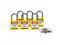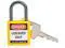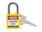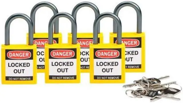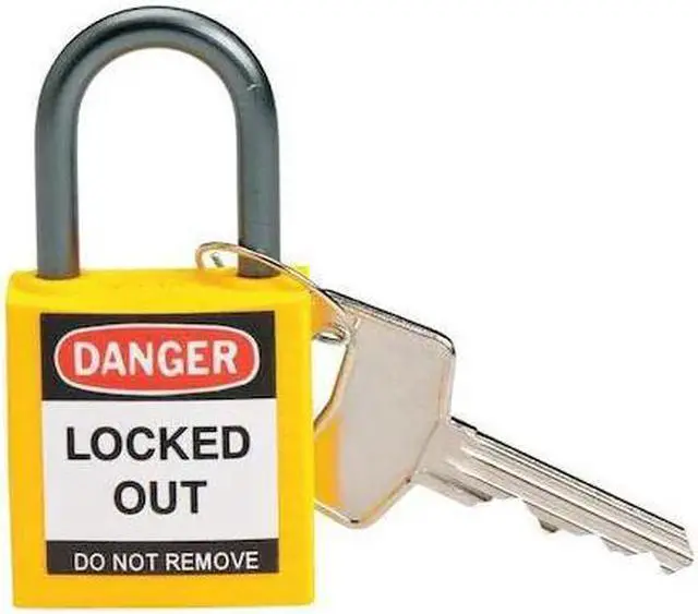 Lockout Padlock, Key Type Alike, Body Material Thermoplastic, Shackle Dia. 13/64 In., Shackle Height 1 In., Shackle Material Aluminum, Shackle Width 3/4 In., Body Width 1-1/5 In., Body Thickness 5/8 In., Legend Danger Locked Out Do Not Remove, Includes English, Spanish, French Lockout Labels, Standards OSHA 1910.147, Body Height 1-2/5 In., Body Color Yellow, Control Key Registration Required No, Shackle Type Open, Number of Keys 1, Number of Pins 5, Padlock Body Shape Rectangular.