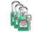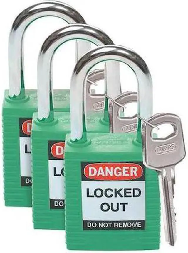 Lockout Padlock, Key Type Alike, Body Material Thermoplastic, Shackle Dia. 1/4 In., Shackle Height 1-1/2 In., Shackle Material Hardened Steel, Shackle Width 3/4 In., Body Width 1-1/2 In., Body Thickness 4/5 In., Legend Danger Locked Out Do Not Remove, Includes English, Spanish, French Lockout Labels, Standards OSHA 1910.147, Body Height 1-3/4 In., Body Color Green, Control Key Registration Required No, Shackle Type Open, Number of Keys 1, Number of Pins 6, Padlock Body Shape Rectangular.
