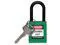 Lockout Padlock, Key Type Different, Body Material Thermoplastic, Shackle Dia. 1/4 In., Shackle Height 1-1/2 In., Shackle Material Plastic, Shackle Width 3/4 In., Body Width 1-1/2 In., Body Thickness 4/5 In., Legend Danger Locked Out Do Not Remove, Includes English, Spanish, French Lockout Labels, Standards OSHA 1910.147, Body Height 1-3/4 In., Body Color Green, Control Key Registration Required No, Shackle Type Open, Number of Keys 1, Number of Pins 6, Padlock Body Shape Rectangular.
