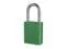 Lockout Padlock, Body Color Green, Body Height 1 7/8 in, Body Material Aluminum, Body Thickness 3/4 in, Body Width 1 1/2 in, Header Not Applicable, Horizontal Shackle Clearance 13/16 in, Key Style Standard, Key Type Keyed Different, Non-Removable Key No, Resistance Properties Corrosion Resistant, Shackle Diameter 1/4 in, Shackle Height 1 1/2 in, Shackle Material Boron Alloy, Shackle Type Open, Vertical Shackle Clearance 1 1/2 in, Width Across Shackle 13/16 in, Body Material Coating Anodized. This item has been restricted from sale in the following state (s): []