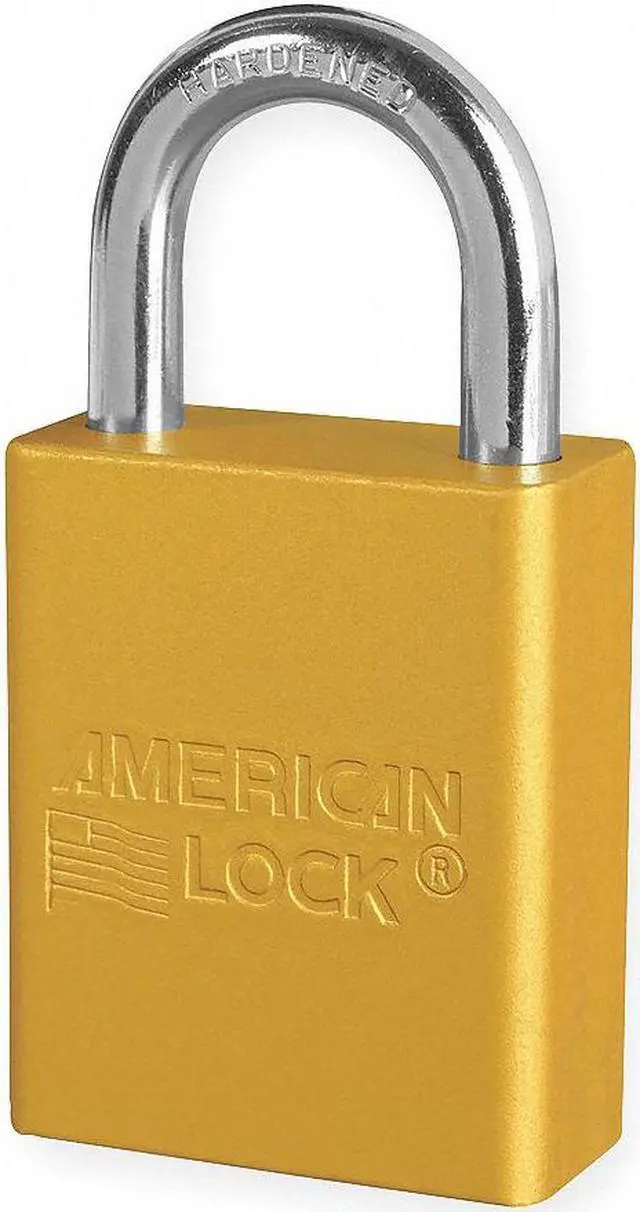 Lockout Padlock, Body Color Yellow, Body Height 1 7/8 in, Body Material Aluminum, Body Thickness 3/4 in, Body Width 1 1/2 in, Header Not Applicable, Horizontal Shackle Clearance 13/16 in, Key Style Standard, Key Type Keyed Alike, Non-Removable Key No, Resistance Properties Corrosion Resistant, Shackle Diameter 1/4 in, Shackle Height 1 in, Shackle Material Boron Alloy, Shackle Type Open, Vertical Shackle Clearance 1 in, Width Across Shackle 13/16 in, Body Material Coating Anodized. This item has been restricted from sale in the following state (s): []