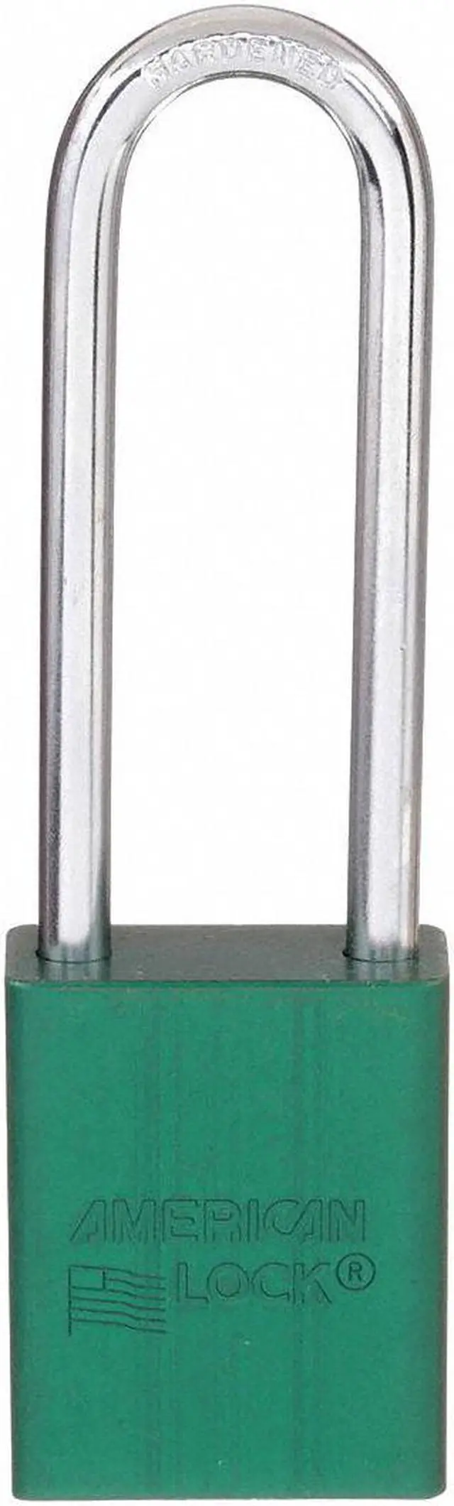 Lockout Padlock, Body Color Green, Body Height 1 7/8 in, Body Material Aluminum, Body Thickness 3/4 in, Body Width 1 1/2 in, Header Not Applicable, Horizontal Shackle Clearance 13/16 in, Key Style Standard, Key Type Keyed Different, Non-Removable Key No, Resistance Properties Corrosion Resistant, Shackle Diameter 1/4 in, Shackle Height 3 in, Shackle Material Boron Alloy, Shackle Type Extended, Vertical Shackle Clearance 3 in, Width Across Shackle 13/16 in, Body Material Coating Anodized. This item has been restricted from sale in the following state (s): []