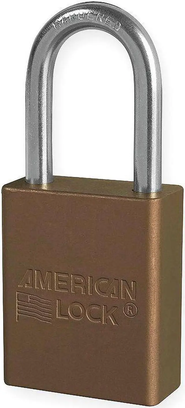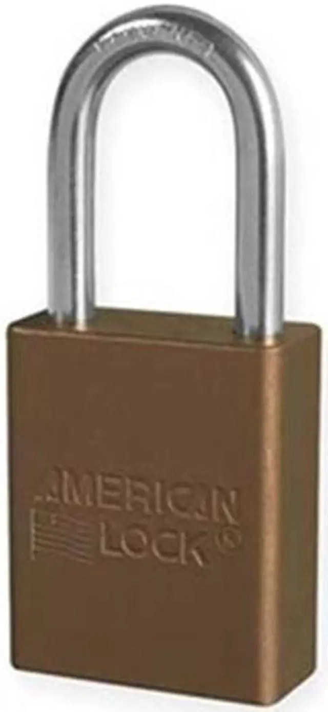 Lockout Padlock, Body Color Brown, Body Height 1 7/8 in, Body Material Aluminum, Body Thickness 3/4 in, Body Width 1 1/2 in, Header Not Applicable, Horizontal Shackle Clearance 13/16 in, Key Style Standard, Key Type Keyed Alike, Non-Removable Key No, Resistance Properties Corrosion Resistant, Shackle Diameter 1/4 in, Shackle Height 1 1/2 in, Shackle Material Boron Alloy, Shackle Type Open, Vertical Shackle Clearance 1 1/2 in, Width Across Shackle 13/16 in, Body Material Coating Anodized. This item has been restricted from sale in the following state (s): []