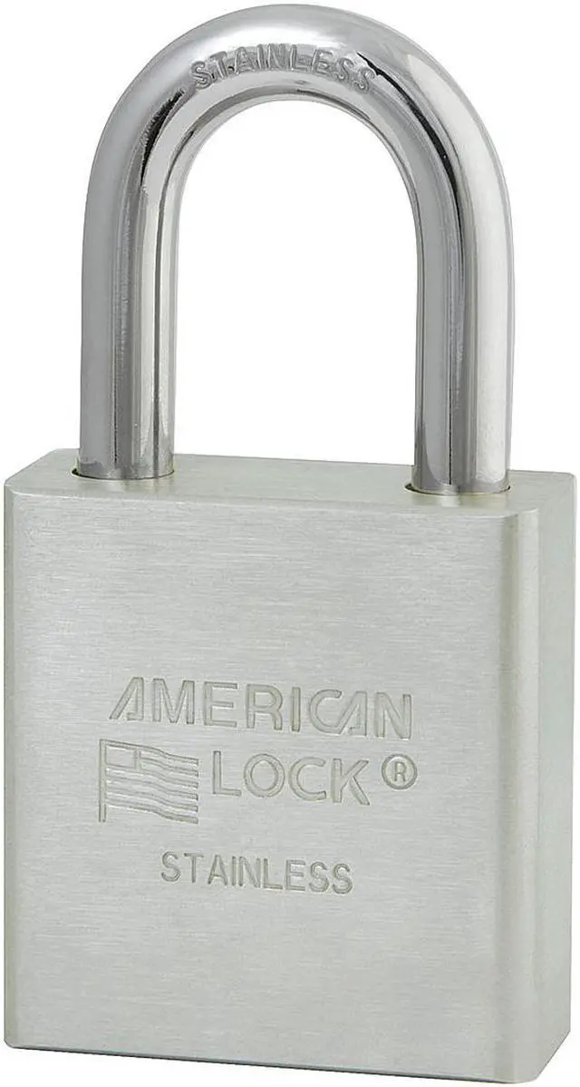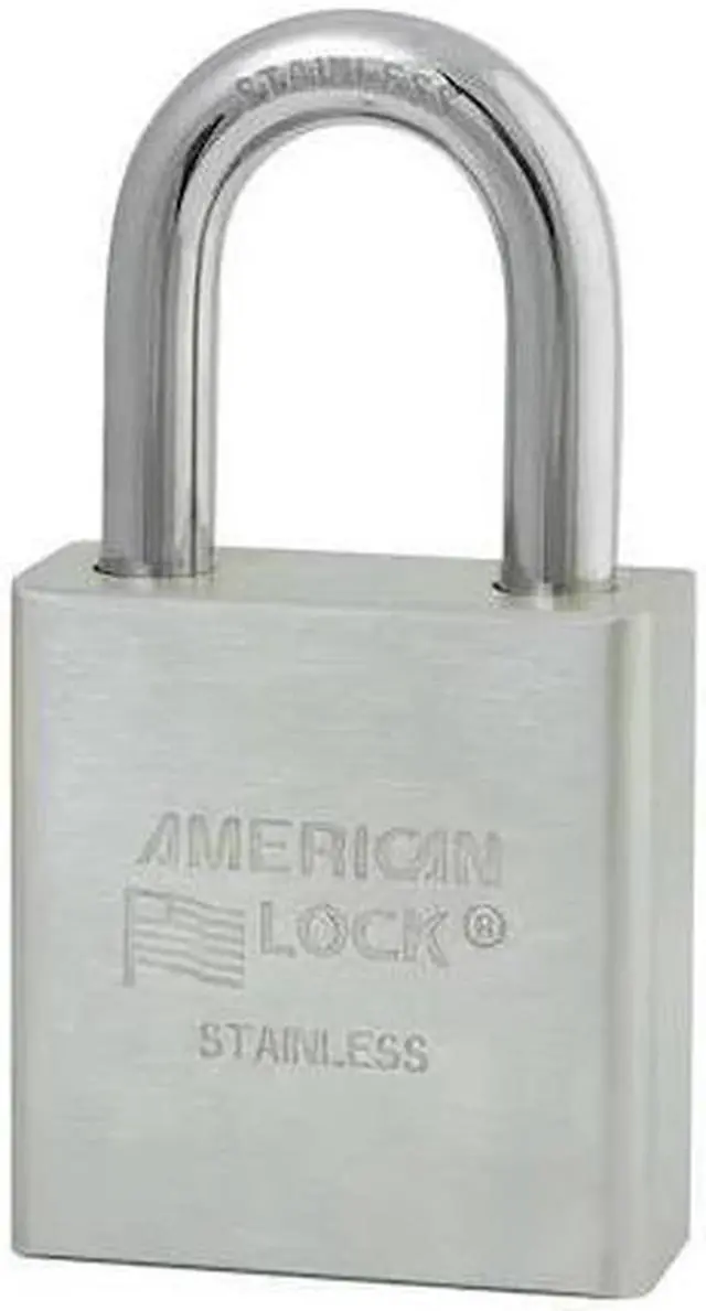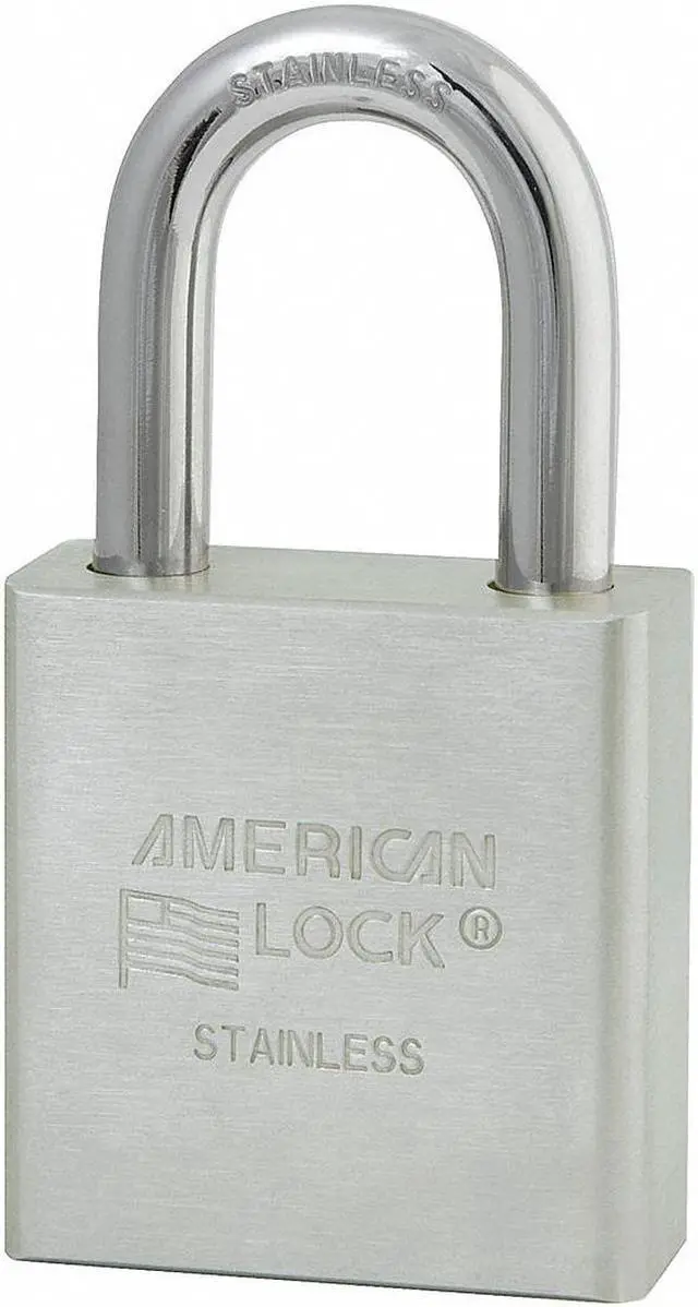 Padlock, Shackle Dia. 5/16 in, Shackle Height 1 1/8 in, Shackle Width 3/4 in, Shackle Material Stainless Steel, Body Height 2 13/32 in, Body Width 1 3/4 in, Body Thickness 3/4 in, Body Material Stainless Steel, Number of Bumpers 0, Number of Pins 5 Pin, Key Type Alike, Control Key Registration Required No, Body Color Silver, Keyway Type American AK5, Weather Resistant Yes, High Security Yes, Interchangeable Core No, Padlock Body Shape Rectangular, Rekeyable Yes, Shackle Type Standard Shackle.