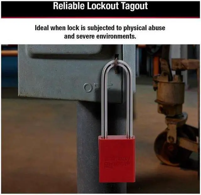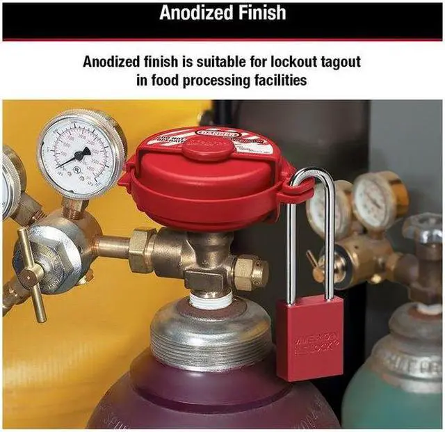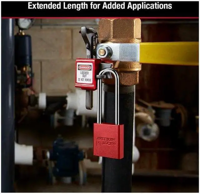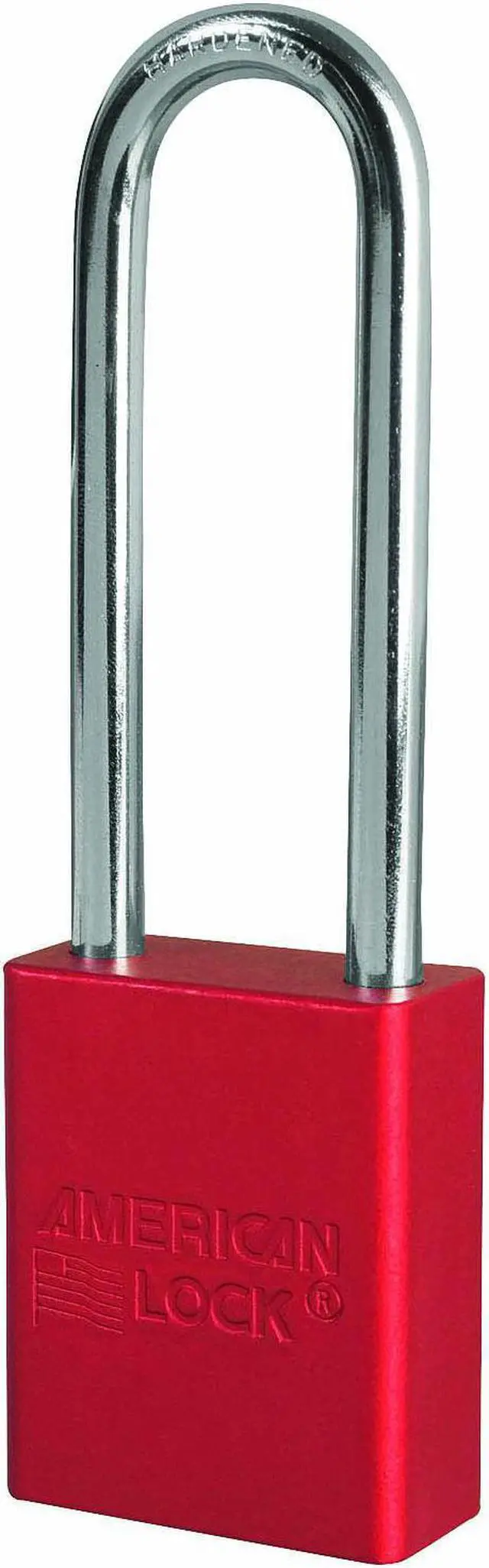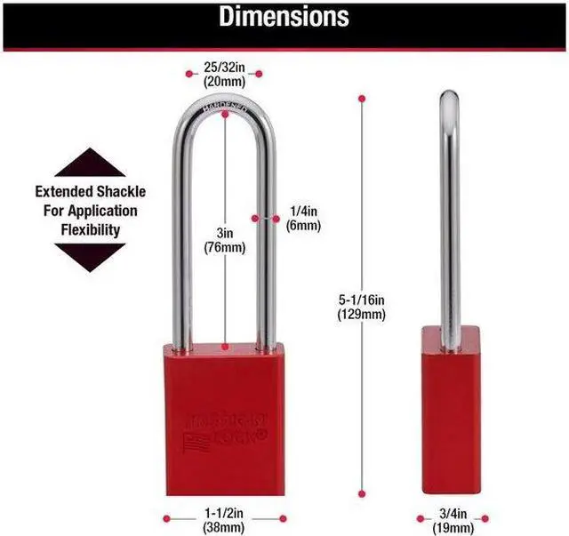 Lockout Padlock, Body Color Red, Body Height 1 7/8 in, Body Material Aluminum, Body Thickness 3/4 in, Body Width 1 1/2 in, Header Not Applicable, Horizontal Shackle Clearance 13/16 in, Key Style Standard, Key Type Keyed Different, Non-Removable Key No, Resistance Properties Corrosion Resistant, Shackle Diameter 1/4 in, Shackle Height 3 in, Shackle Material Boron Alloy, Shackle Type Extended, Vertical Shackle Clearance 3 in, Width Across Shackle 13/16 in, Body Material Coating Anodized. This item has been restricted from sale in the following state (s): []