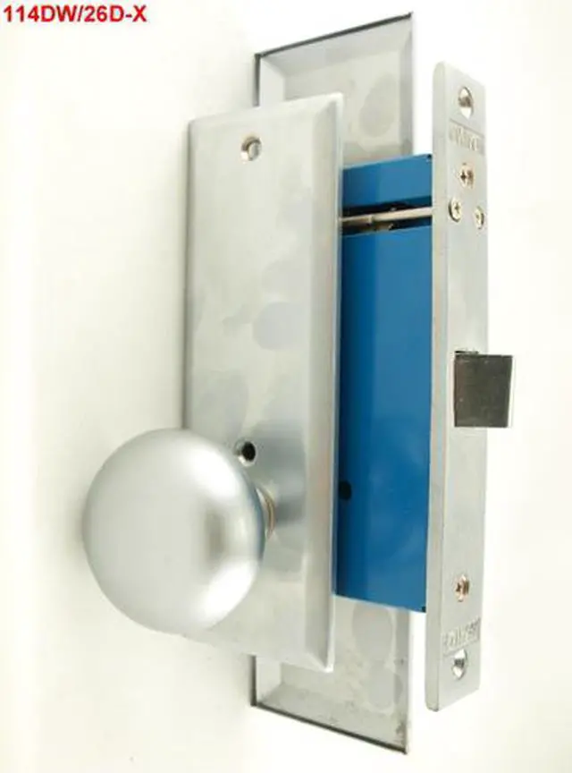 Maxtech (Like Marks 114DW/26D-X), Satin Chrome 26D, Wide Face Plate, Left Hand, Heavy Duty Vestibule Function Always Locked Storeroom Lockset, Thru Bolted Mortise Lock Set Self Adjusting Spindles with Screwless Knobs. 2-1/2" Backset, Latch Only (No Bolt and Rocker), Wide Face Plate -> front: 1-1/4" x 8". Cylinder on outside and NO thumb turn on inside. Commercial Mortise Lockset