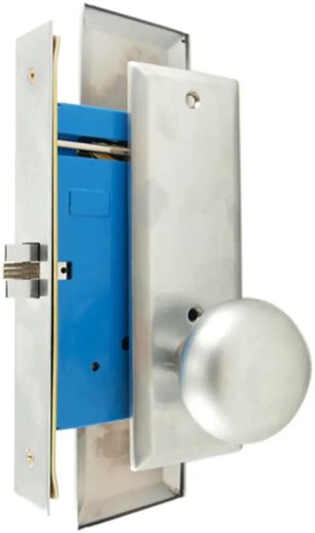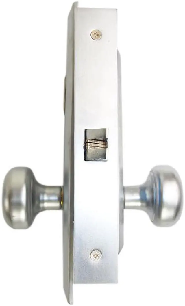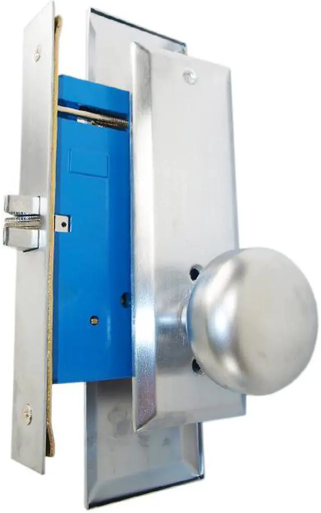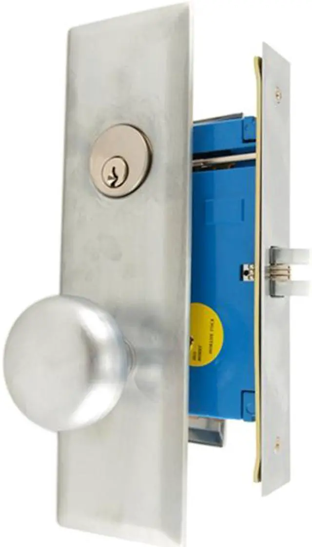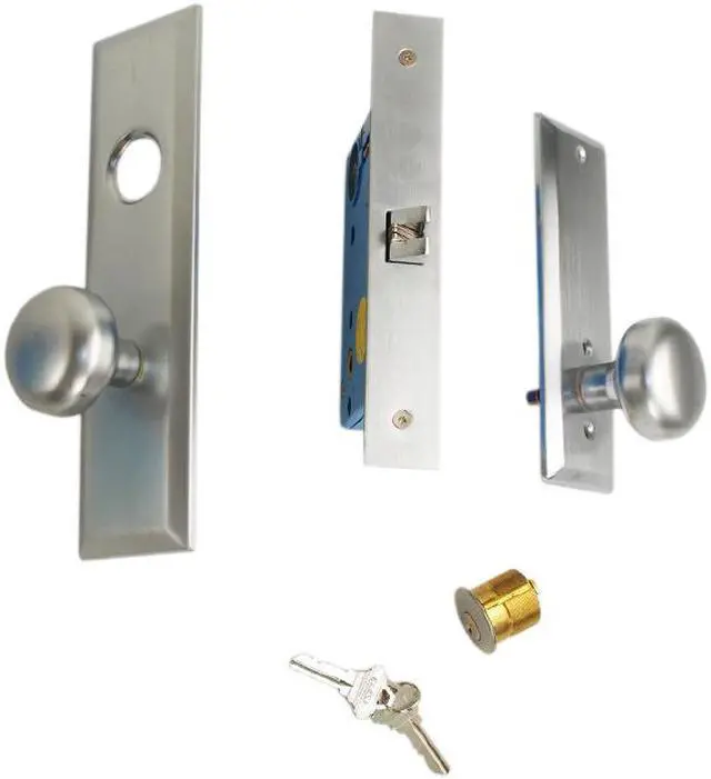 Front face plate: 1-1/4" x 8", Latch: Scissor Latch and Anti Friction Latch. Cylinder on outside and NO thumb turn on inside. Thru-bolted screwless knob plate assemblies Lock Set. Commercial Mortise Locksets.