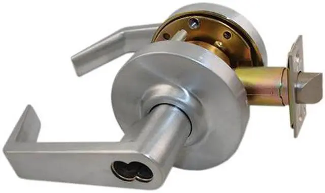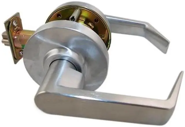 Maxtech LKLE13014C-US26D Satin Chrome US26D Always Locked Vestibule Storeroom Interchangable (IC) Core Grade 2 Commercial Cylindrical ADA Angled Lever Lockset (CORE SOLD SEPERATELY), designed with an outside lever that is rigid while the inside lever has a button for a door 1-3/8" to 1-3/4" thick. The BACKSET is 2-3/4", and the case is a corrosion treated heavy gauge cold roiled mechanism. The front is wrought brass or bronze 2-1/4" x 1-1/8", and the strike is wrought brass or bronze 4-1/8" x 1-1/4" standard. The LATCHBOLT is made out of solid brass with a 1/2" throw, that is reversible (Non-handed) for RH or LH applications, and an adjustable front for flat or beveled doors 1-3/8" x 2" thick. The FINISH is satin chrome US26D. This lockset is a comercial style ic core angle lever lock, grade 2, with storeroom functioning. Easy installation, suitable for new construction and retrofit. Special reinforced removable studs prevent twisting or turning of lock rosettes. UL listed for "A" label (3 hours) single swing doors (4' x 8'). Concealed screw mount. One step rosette. Patented free-wheeling design rotates lever up and down while lever set stays locked. Conforms to Handicap Code ANSI A156.2 Series 4000. Made in Korea.