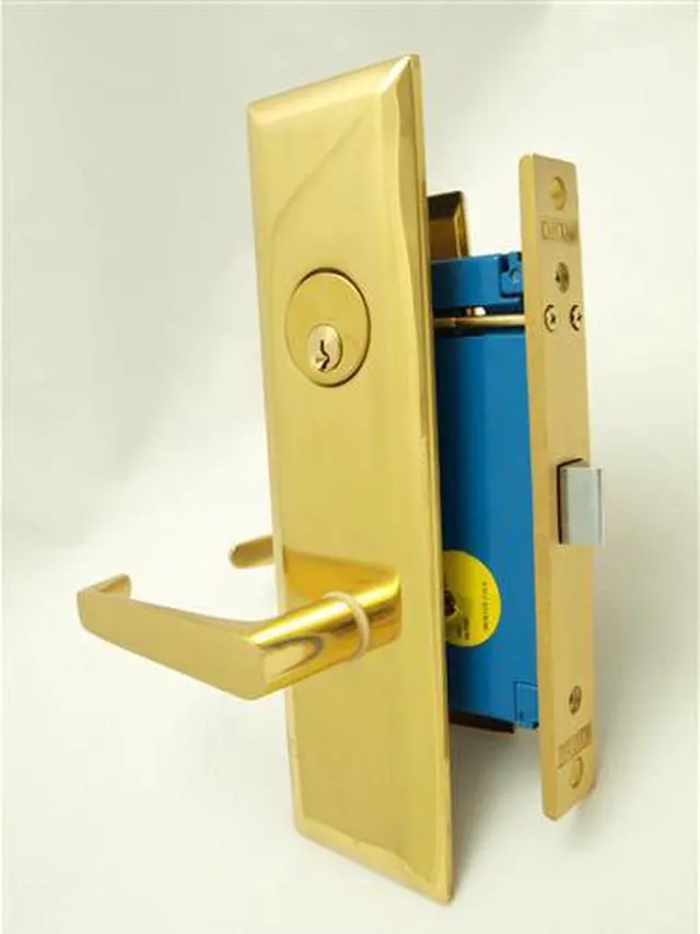 Marks New Yorker 9NY92DW/3, Polished Brass Left Hand Mortise Lock Lever Vestibule Function Always Locked Storeroom Lockset. 2-1/2" Backset, Latch Only (No Bolt and Rocker), Front face plate:1-1/16" x 7-5/8". Cylinder on outside and NO thumb turn on inside. Thru-bolted screwless lever plate assemblies Lock Set. Independent spring loaded captivated spindles. Lever support springs. This ADA approved handicap Marks USA brass escutcheon plates and levers enhance the look of the door. Commercial Mortise Locksets.